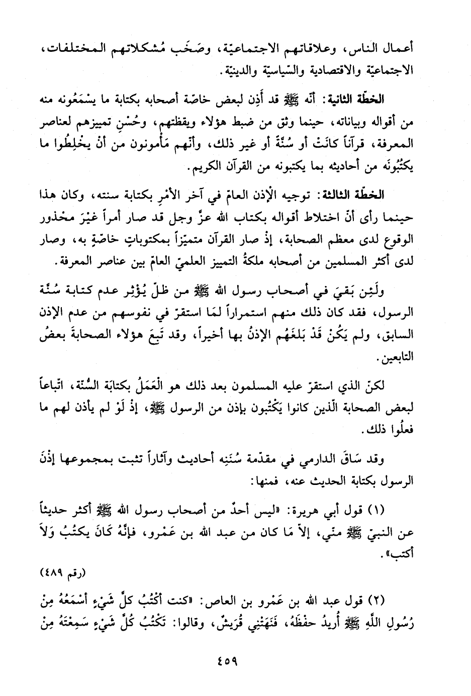 2- قول عبد الله بن عمرو بن العاص: "كنت أكتب كل شيء أسمعه من رسول الله صلى الله عليه وسلم أريد حفظه، فنهتني قريش، وقالوا: تكتب كل شيء سمعته من