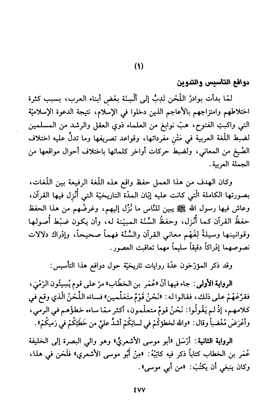 الرواية الأولى: جاء فيها أن "عمر بن الخطاب" مر على قوم يسيئون الرمي، فقرعهم على ذلك، فقالوا له: "نحن قوم متعلمين" فساءه اللحن الذي وقع في كلامهم؛ إذ لم يقولوا: نحن قوم متعلمون، أكثر مما ساءه خطؤهم في الرمي، وأعرض مغضبًا وقال: "ولله لخطؤكم في لسانكم أشد على من خطئكم في رميكم".