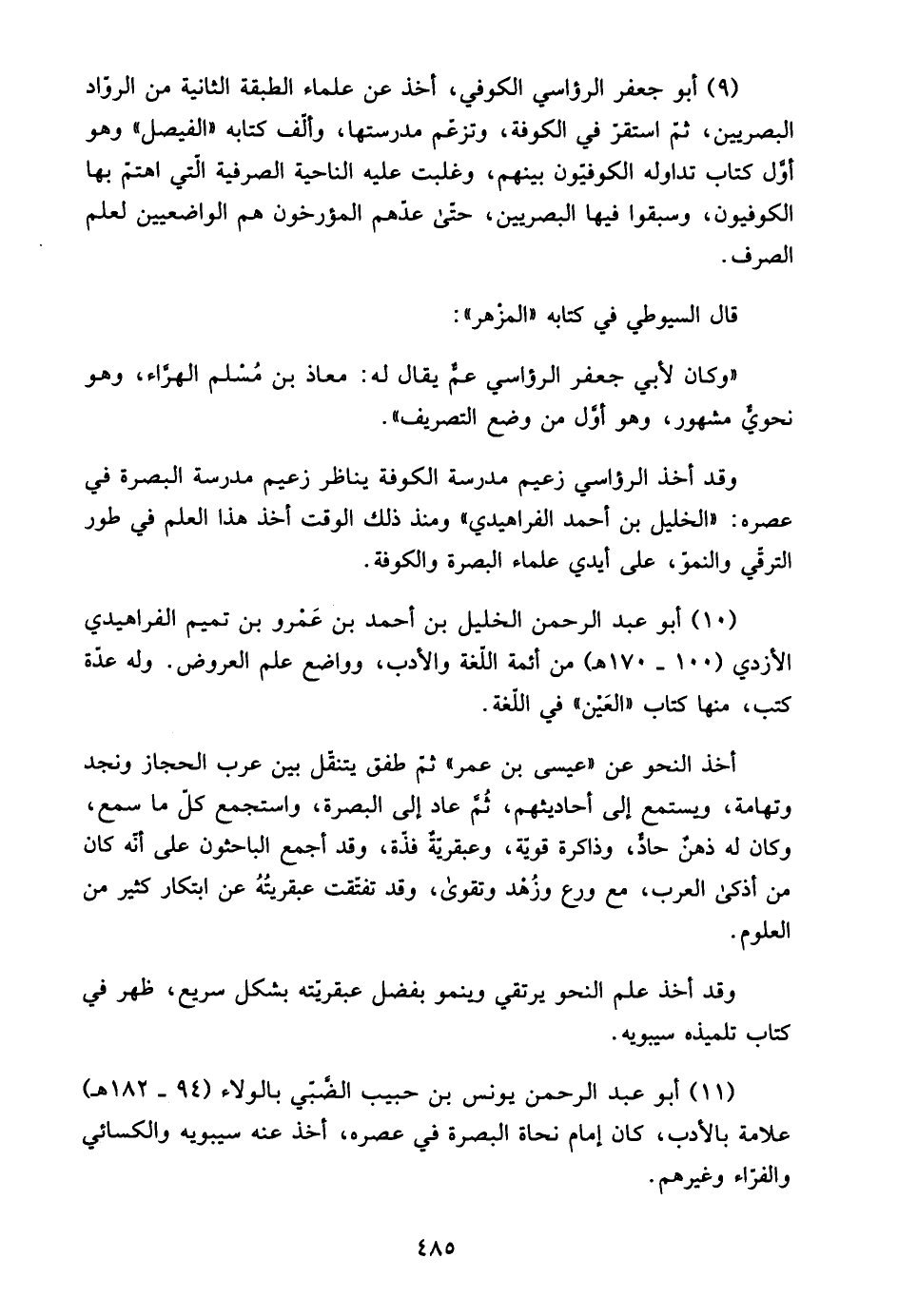 9- أبو جعفر الرؤاسي الكوفي، أخذ عن علماء الطبقة الثانية من الرواد البصريين، ثم استقر في الكوفة، وتزعم مدرستها، وألف كتابه "الفيصل" وهو أول كتاب تداوله الكوفيون بينهم، وغلبت عليه الناحية الصرفية التي اهتم بها الكوفيون، وسبقوا فيها البصريين، حتى عدهم المؤرخون هم الواضعين لعلم الصرف.