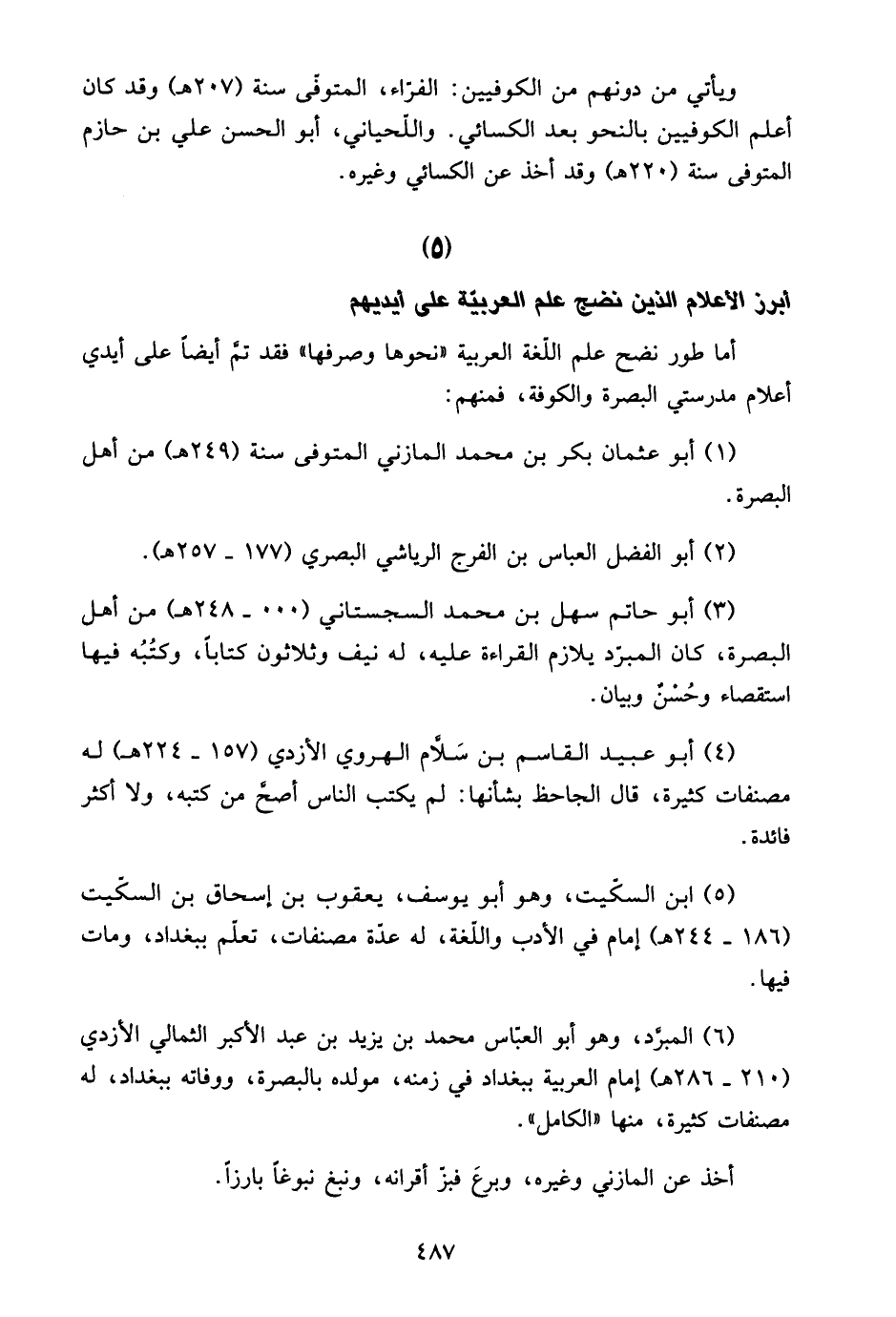 6- المبرد: وهو أبو العباس محمد بن يزيد بن عبد الأكبر الثمالي الأزدي "210-286هـ" إمام العربية ببغداد في زمنه، مولده بالبصرة، ووفاته ببغداد، له مصنفات كثيرة، منها "الكامل".
