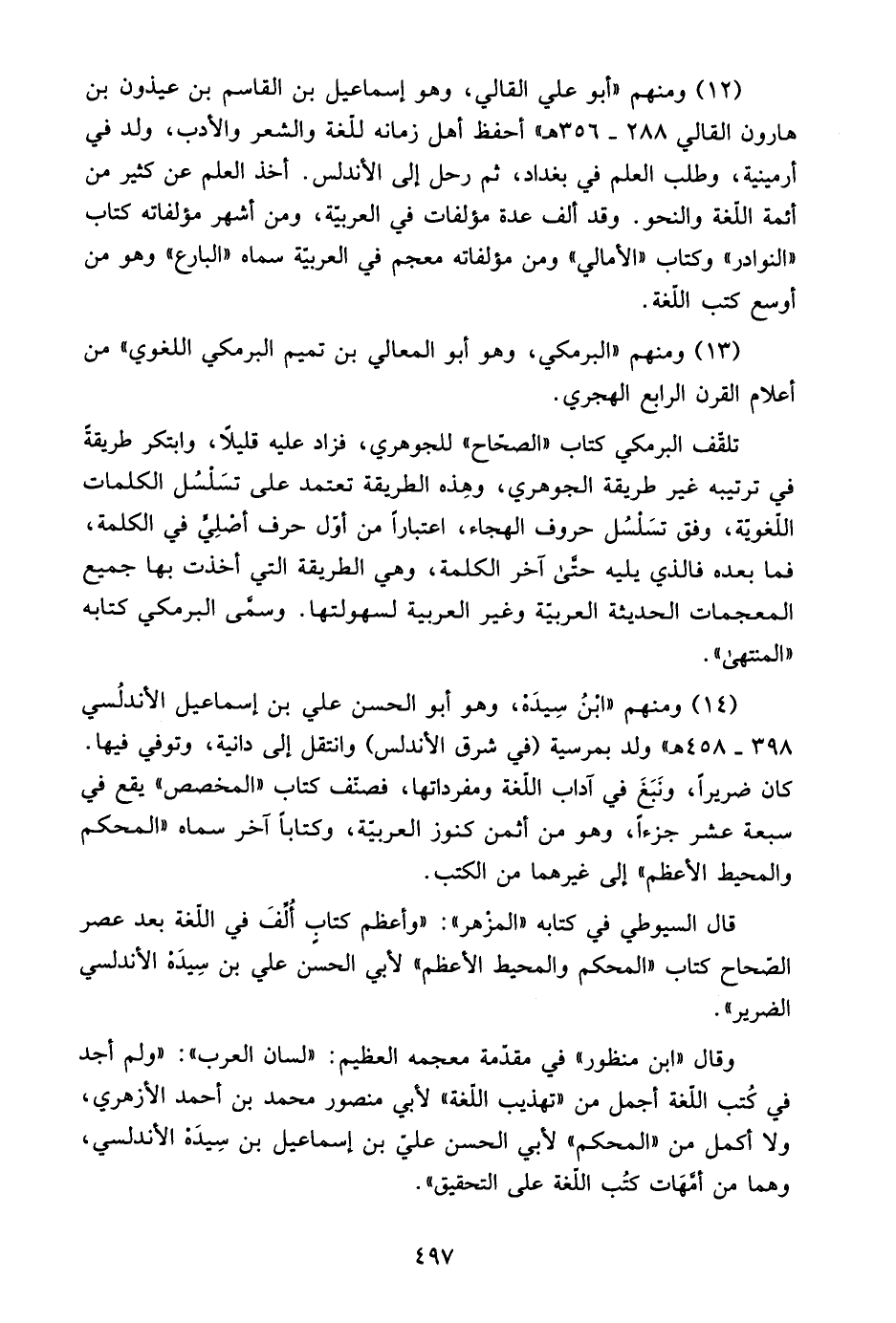 12- ومنهم "أبو علي القالي، وهو إسماعيل بن القاسم بن عيذون بن هارون القالي 288-356هـ" أحفظ أهل زمانه للغة والشعر والأدب، ولد في أرمينية، وطلب العلم في بغداد، ثم رحل إلى الأندلس. أخذ العلم عن كثير من أئمة اللغة والنحو. وقد ألف عدة مؤلفات في العربية، ومن أشهر مؤلفاته كتاب "النوادر" وكتاب "المالي" ومن مؤلفاته معجم في العربية سماه "البارع" وهو من أوسع كتب اللغة.