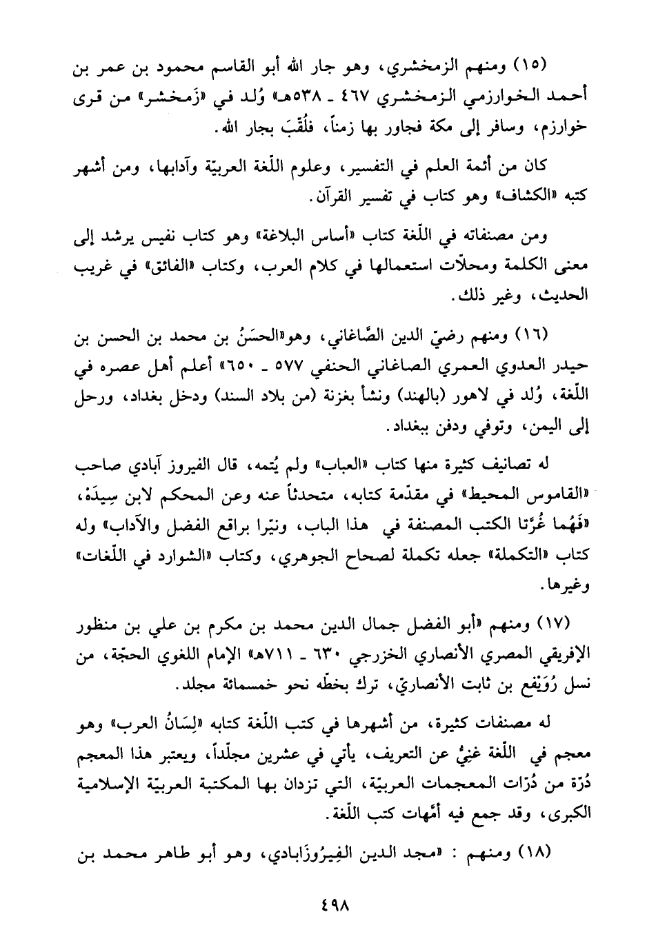 498- ومنهم الزمخشري، وهو جار الله أبو القاسم محمود بن عمر بن أحمد الخوارزمي الزمخشري 467-538هـ ولد في "زمخشر" من قرى خوارزم، وسافر إلى مكة فجاور بها زمنًا فلقب بجار الله.