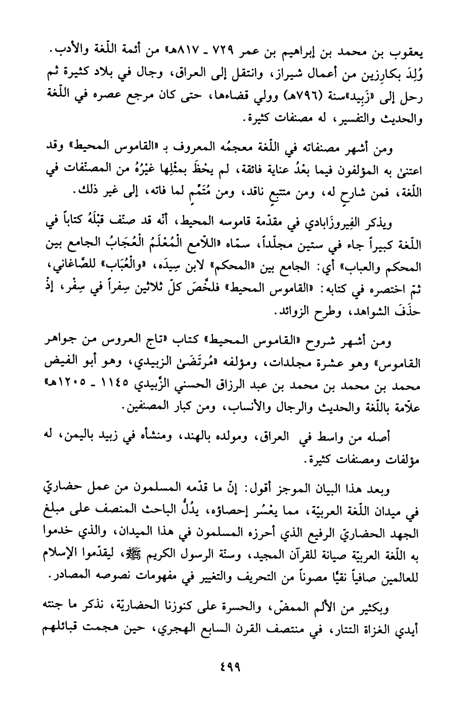 وبعد هذا البيان الموجز أقول: إن ما قدمه المسلمون من عمل حضاري في ميدان اللغة العربية، مما يعسر إحصاؤه، يدل الباحث المنصف على مبلغ الجهد الحضاري الرفيع الذي أحرزه المسلمون في هذا الميدان، والذي خدموا به اللغة العربية صيانة للقرآن المجيد، وسنة الرسول الكريم صلى الله عليه وسلم، ليقدموا الإسلام للعالمين صافيًا نقيًّا مصونًا من التحريف والتغيير في مفهومات نصوصه المصادر.
