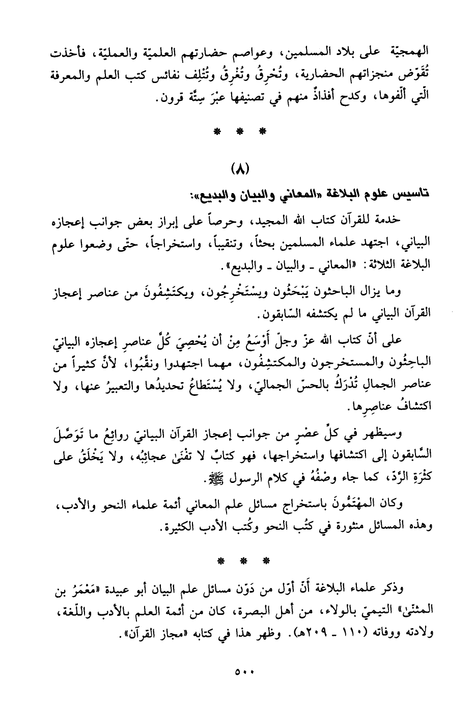 8- تأسيس علوم البلاغة "المعاني والبيان والبديع":