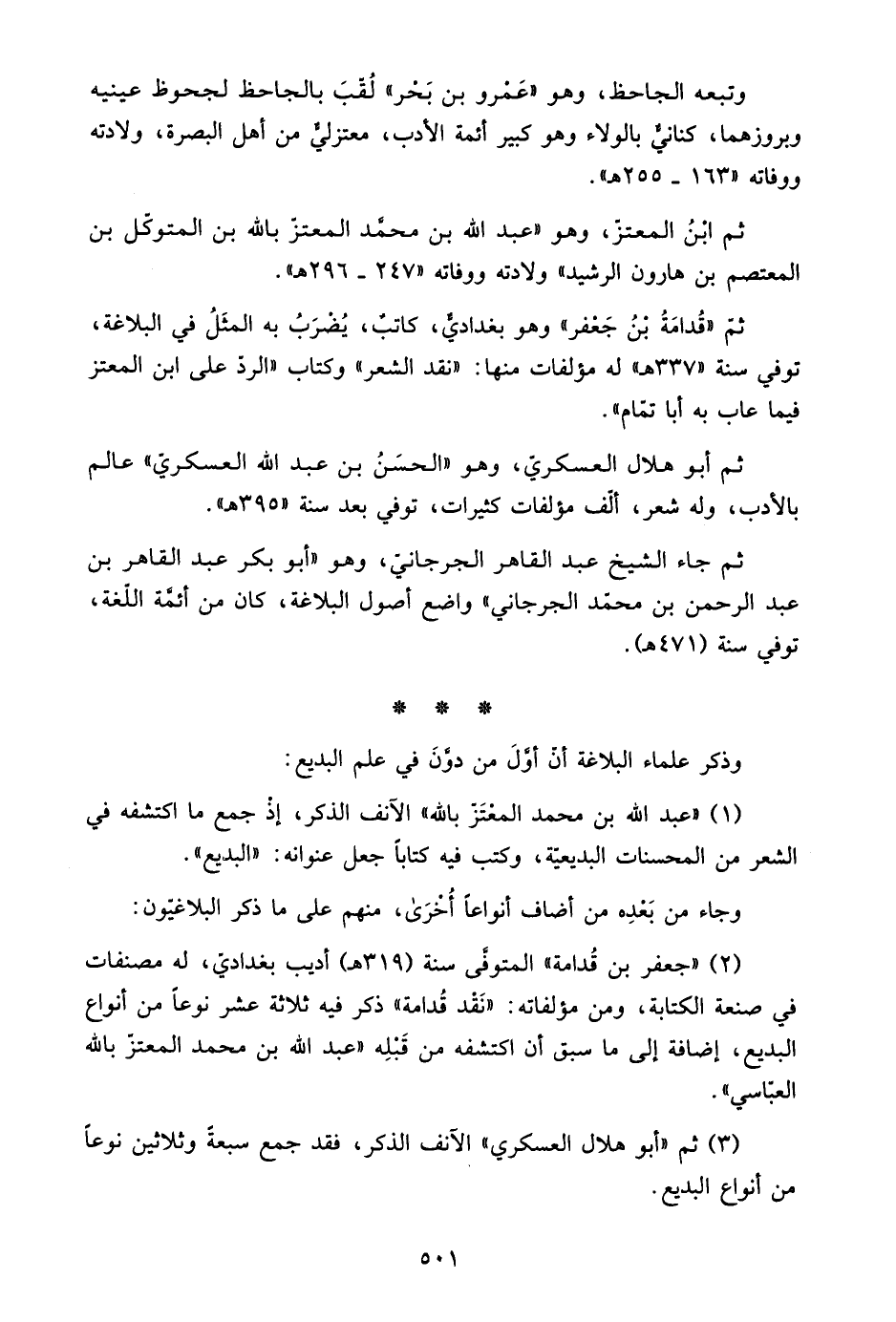 ثم "قدامة بن جعفر" وهو بغدادي، كاتب، يضرب به المثل في البلاغة، توفي سنة "337هـ" له مؤلفات منها: "نقد الشعر" وكتاب "الرد على ابن المعتز فيما عاب به أبا تمام".