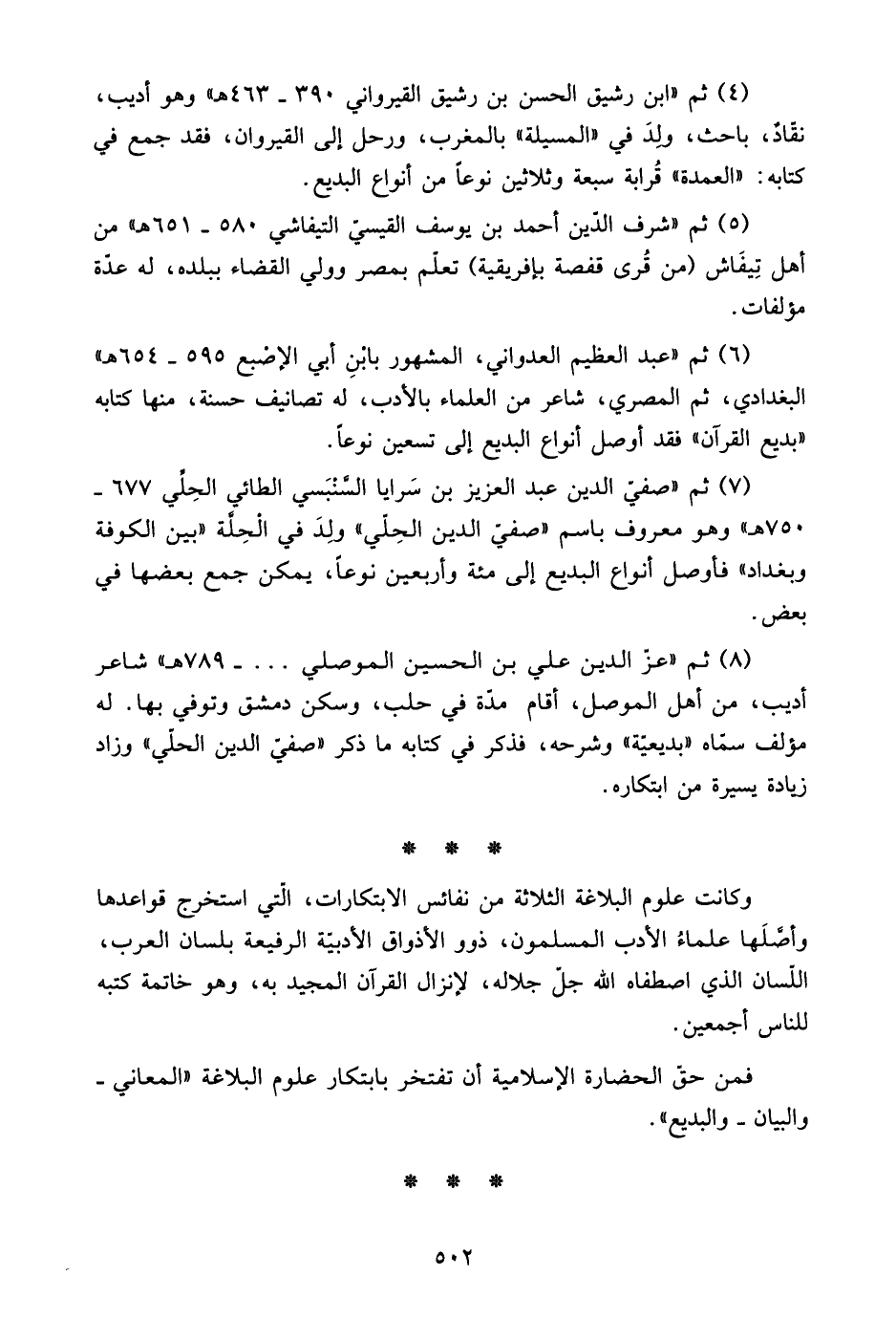 7- ثم "صفي الدين عبد العزيز بن سرايا السنبسي الطائي الحلي 677-750هـ" وهو معروف باسم "صفي الدين الحلي" ولد في الحلة "بين الكوفة وبغداد" فأوصل أنواع البديع إلى مائة وأربعين نوعًا، يمكن جمع بعضها في بعض.