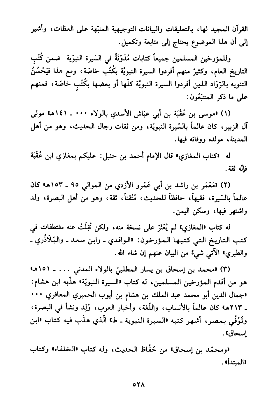 3- "محمد بن إسحاق بن يسار المطلبي بالولاء المدني 000-151هـ" هو من أقدم المؤرخين المسلمين، له كتاب "السيرة النبوية" هذبه ابن هشام: "جمال الدين أبو محمد عبد الملك بن هشام بن أيوب الحميري المعافري 000-213هـ" كان عالمًا بالأنساب، واللغة، وأخبار العرب، ولد ونشأ في البصرة، وتوفي بمصر، أشهر كتبه "السيرة النبوية- ط" الذي هذب فيه كتاب "ابن إسحاق".
