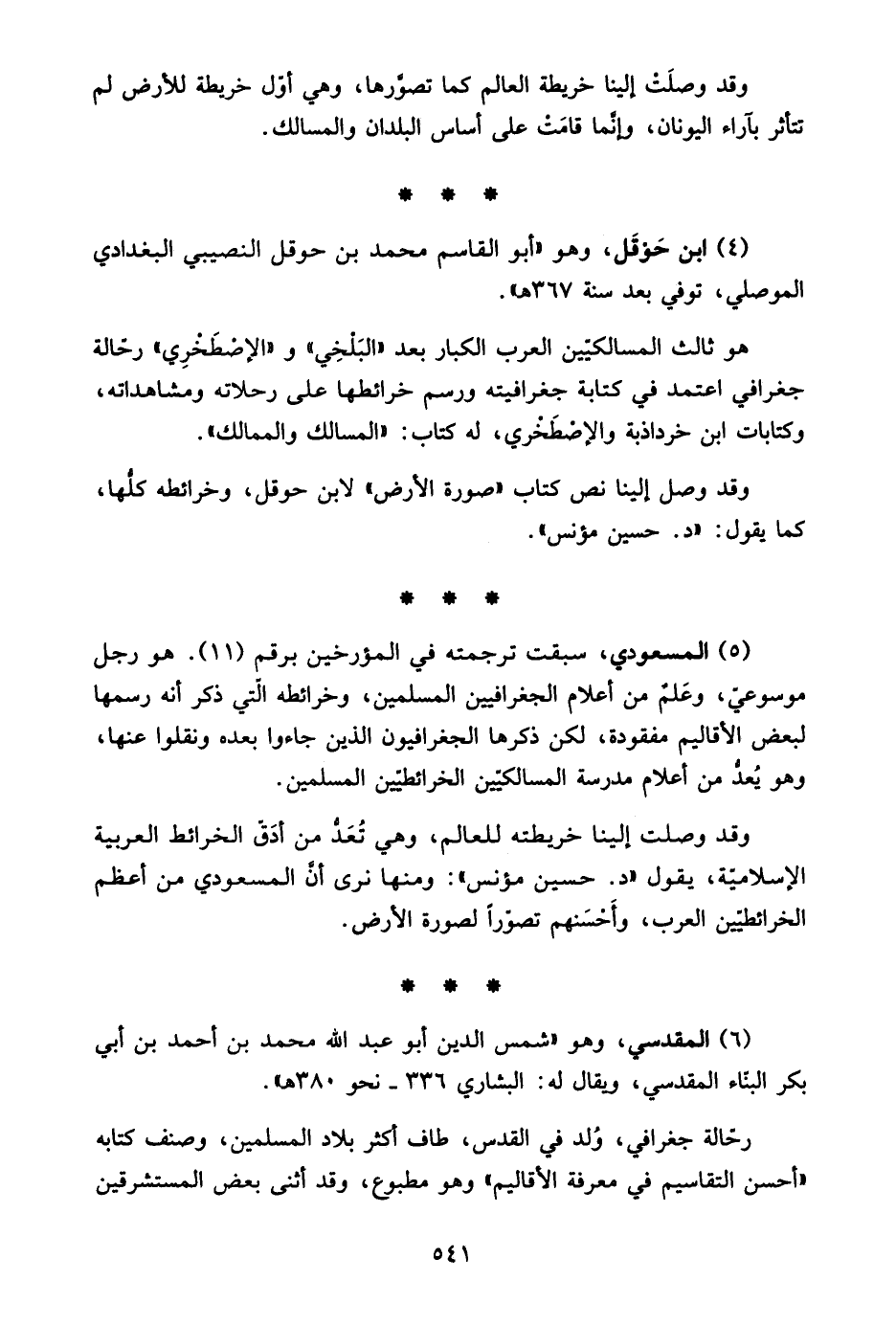 4- ابن حوقل، وهو "أبو القاسم محمد بن حوقل النصيبي البغدادي الموصلي، توفي بعد سنة 367هـ".