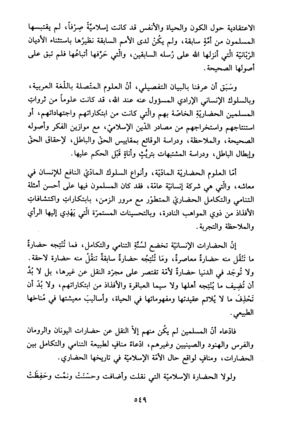 أما العلوم الحضارية المادية، وأنواع السلوك المادي النافع للإنسان في معاشه، والتي هي شركة إنسانية عامة، فقد كان المسلمون فيها على أحسن أمثلة التنامي والتكامل الحضاري المتطور مع مرور الزمن، بابتكارات واكتشافات الأفذاذ من ذوي المواهب النادرة، وبالتحسينات المستمرة التي يهدي إليها الرأي والملاحطة والتجربة.