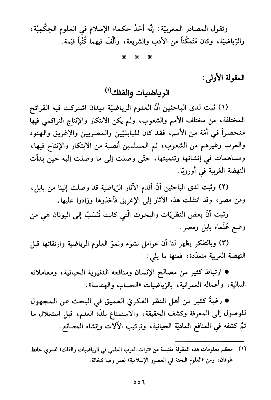 1 معظم معلومات هذه المقولة مقتبسة من "تراث العرب العلمي في الرياضيات والفلك" لقدري حافظ طوقان، ومن "العلوم البحتة في العصور الإسلامية" لعمر رضا كحالة.
