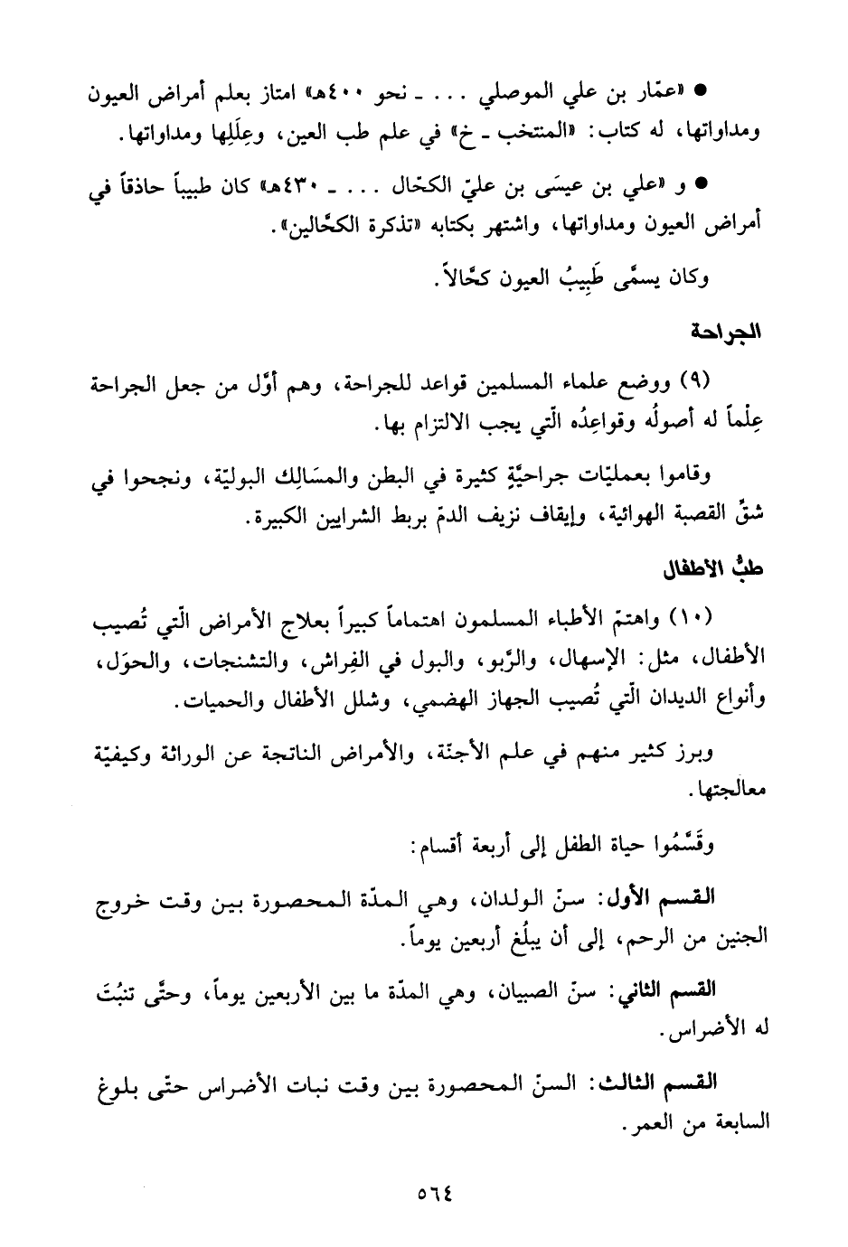- "عمار بن علي الموصلي 000-نحو 400هـ" امتاز بعلم أمراض العيون ومداواتها، له كتاب: "المنتخب، خ" في علم طب العين، وعللها ومداوتها.