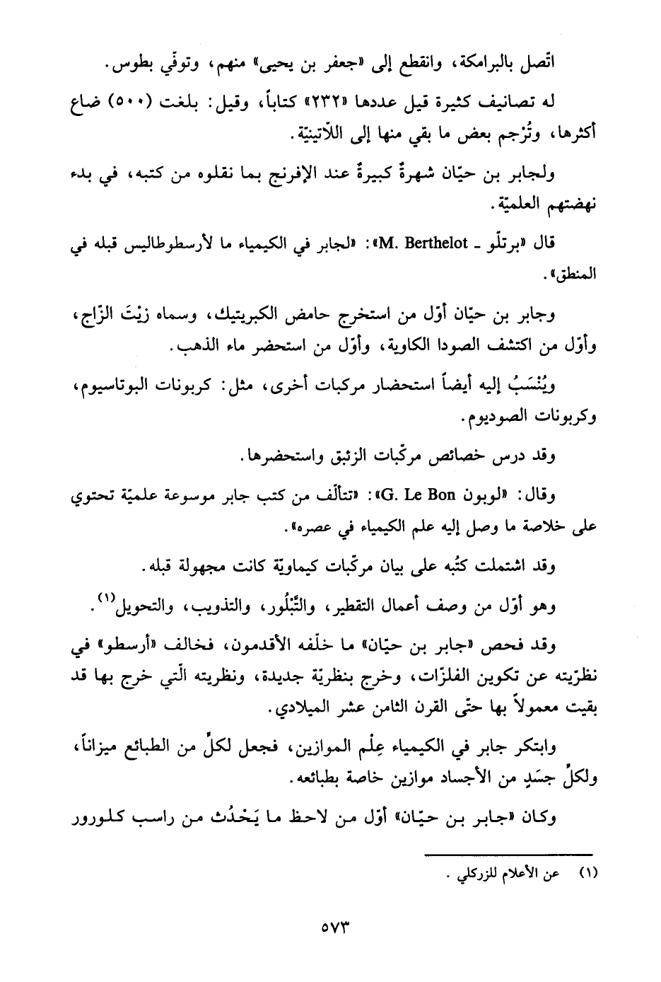 قال "برتلو - M. Berthelot": "لجابر في الكيمياء ما لأرسطوطاليس قبله في المنطق".