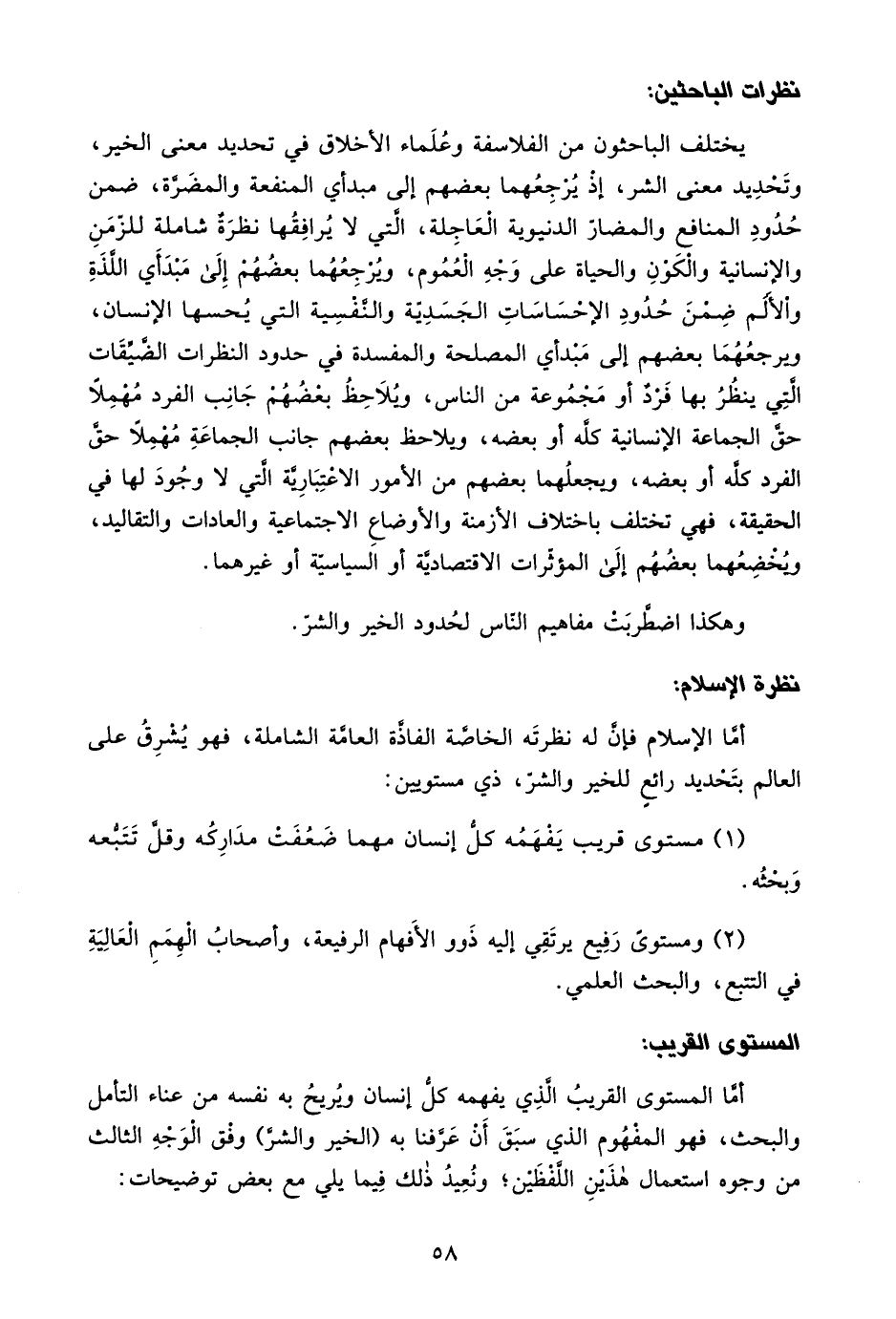 أما الإسلام فإن له نظرته الخاصة الفاذة العامة الشاملة، فهو يشرق على العالم بتحديد رائع للخير والشر، ذي مستويين: