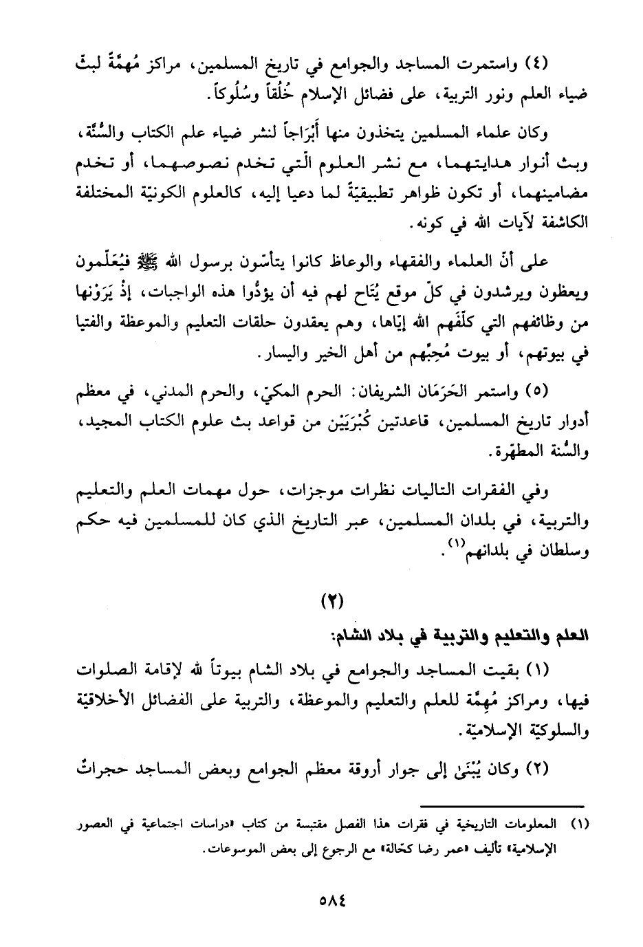 وفي الفقرات التاليات نظرات موجزات، حول مهمات العلم والتعليم والتربية، في بلدان المسلمين، عبر التاريخ الذي كان للمسلمين فيه حكم وسلطان في بلدانهم1.