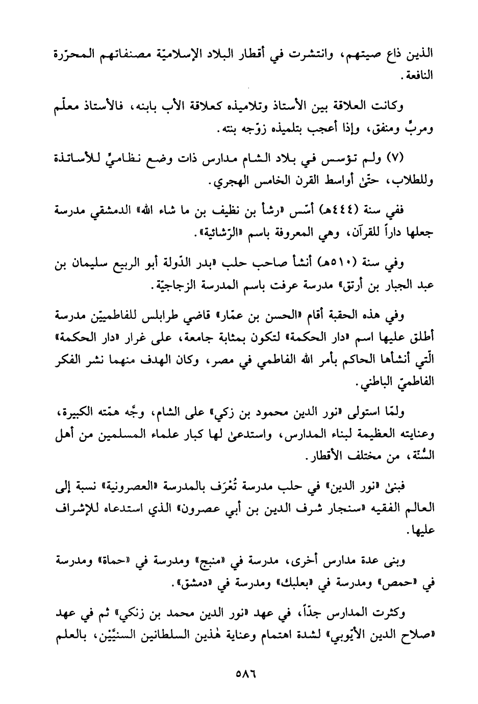 7- ولم تؤسس في بلاد الشام مدارس ذات وضع نظامي للأساتذة وللطلاب، حتى أواسط القرن الخامس الهجري.