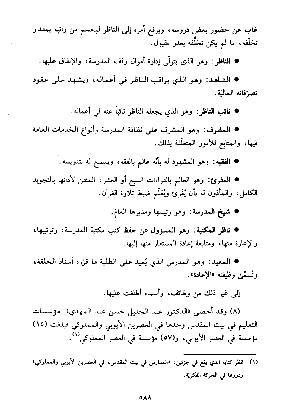 1 انظر كتابه الذي يقع في جزئين: "المدارس في بيت المقدس، في العصرين الأيوبي والمملوكي" ودورها في الحركة الفكرية.