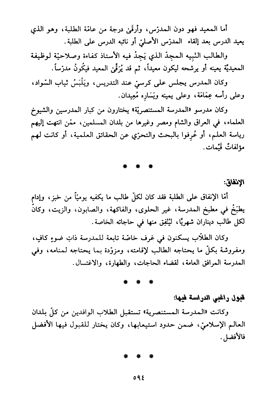 وكانت "المدرسة المستنصرية" تستقبل الطلاب الوافدين من كل بلدان العالم الإسلامي، ضمن حدود استيعابها، وكان يختار للقبول فيها الأفضل فالأفضل.