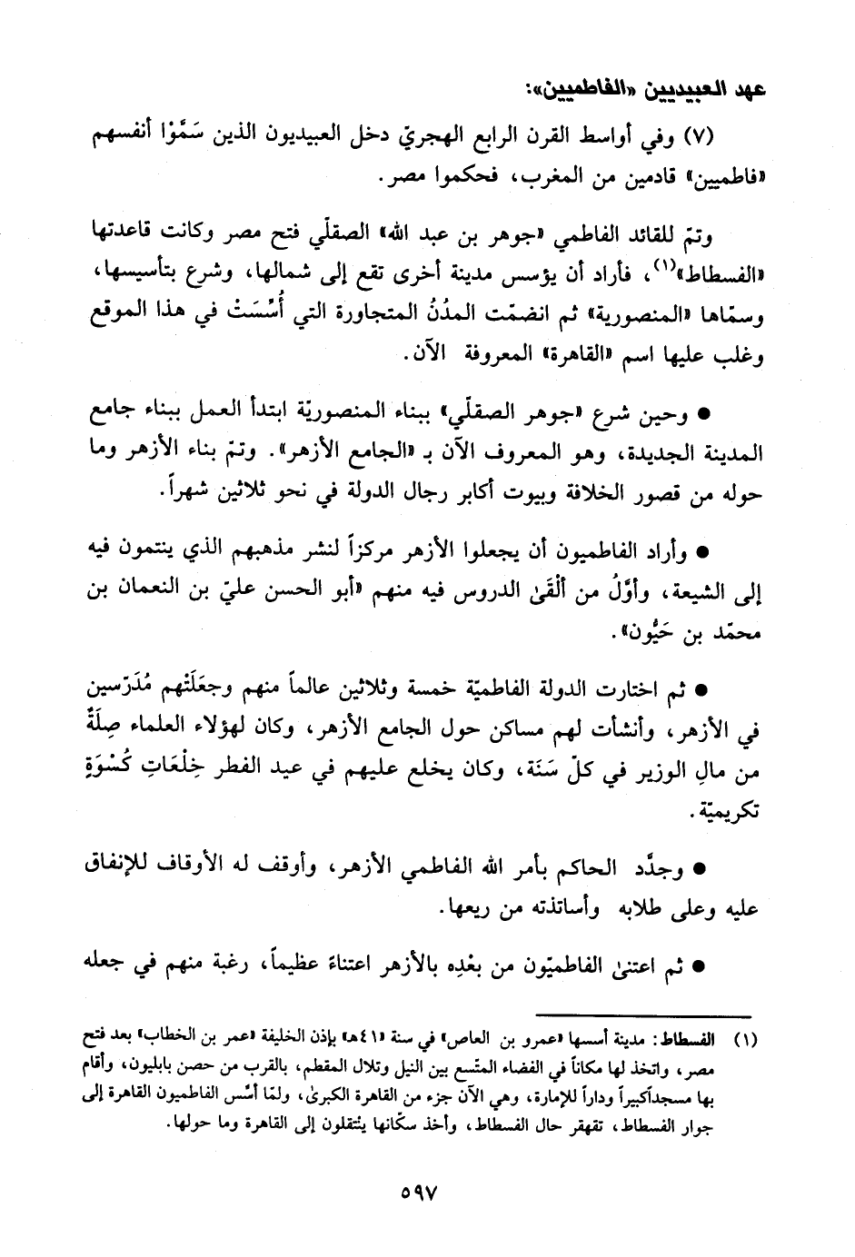 1 الفسطاط: مدينة أسسها "عمر بن العاص" في سنة "41هـ" بإذن الخليفة "عمر بن الخطاب" بعد فتح مصر، واتخذ لها مكانًا في الفضاء المتسع بين النيل وتلال المقطم، بالقرب من حصن بابليون، وأقام بها مسجدًا كبيرًا ودارًا للإمارة، وهي الآن جزء من القاهرة الكبرى، ولما أسس الفاطميون القاهرة إلى جوار الفسطاط، تقهقر حال الفسطاط، وأخذ سكانها ينتقلون إلى القاهرة وما حولها.