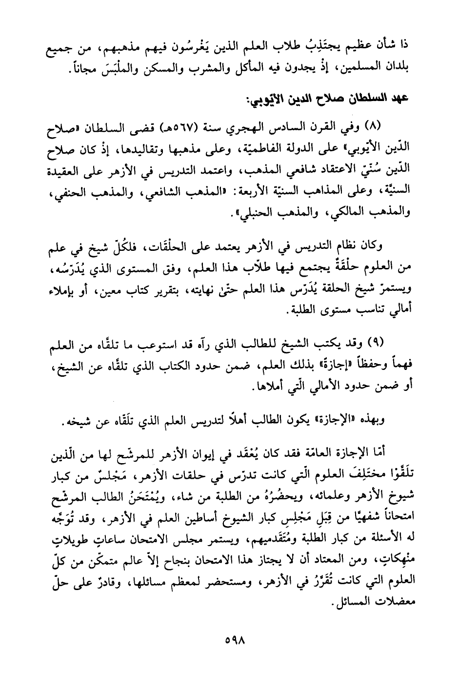 8- وفي القرن السادس الهجري سنة "567هـ" قضى السلطان "صلاح الدين الأيوبي" على الدولة الفاطمية، وعلى مذهبها وتقاليدها؛ إذ كان صلاح الدين سُني الاعتقاد شافعي المذهب، واعتمد التدريس في الأزهر على العقيدة السنية، وعلى المذاهب السنية الأربعة: "المذهب الشافعي" والمذهب الحنفي، والمذهب المالكي، والمذهب الحنبلي".