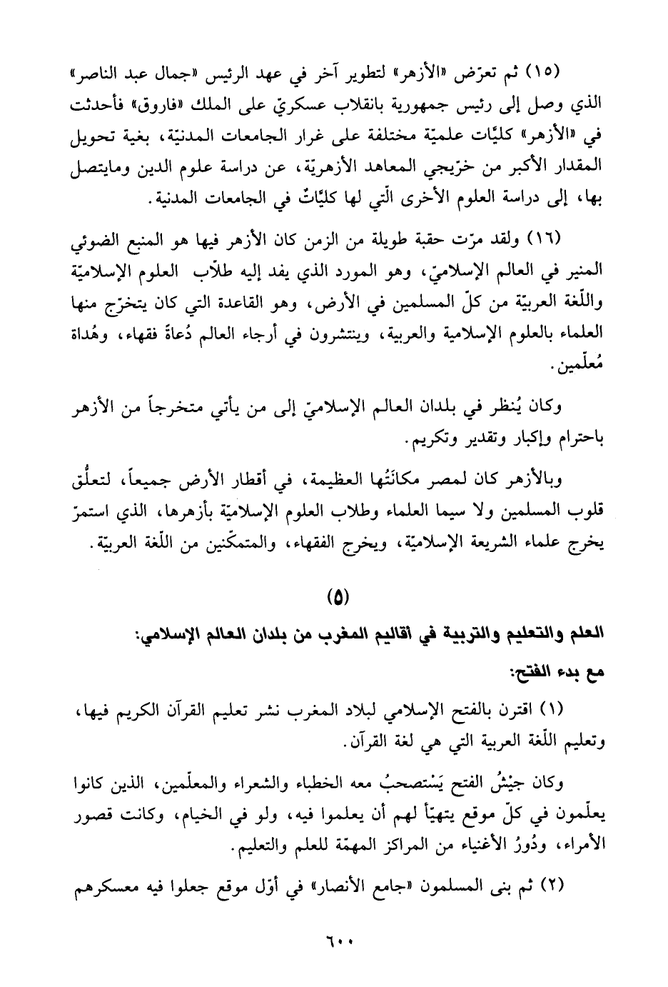 16- ولقد مرت حقبة طويلة من الزمن كان الأزهر فيها هو المنبع الضوئي المنير في العالم الإسلامي، وهو المورد الذي يفد إليه طلاب العلوم الإسلامية واللغة العربية من كل المسلمين من الأرض، وهو القاعدة التي كان يتخرج منها العلماء بالعلوم الإسلامية والعربية، وينتشرون في أرجاء العالم دعاة فقهاء، وهداة معلمين.