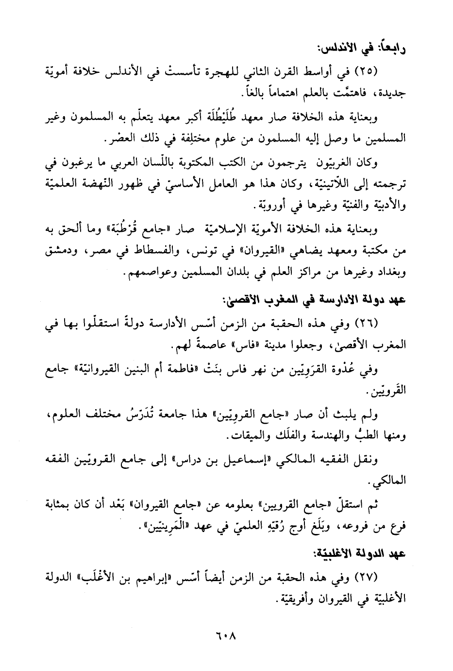 25- في أواسط القرن الثاني للهجرة تأسست في الأندلس خلافة أموية جديدة، فاهتمت بالعلم اهتمامًا بالغًا.