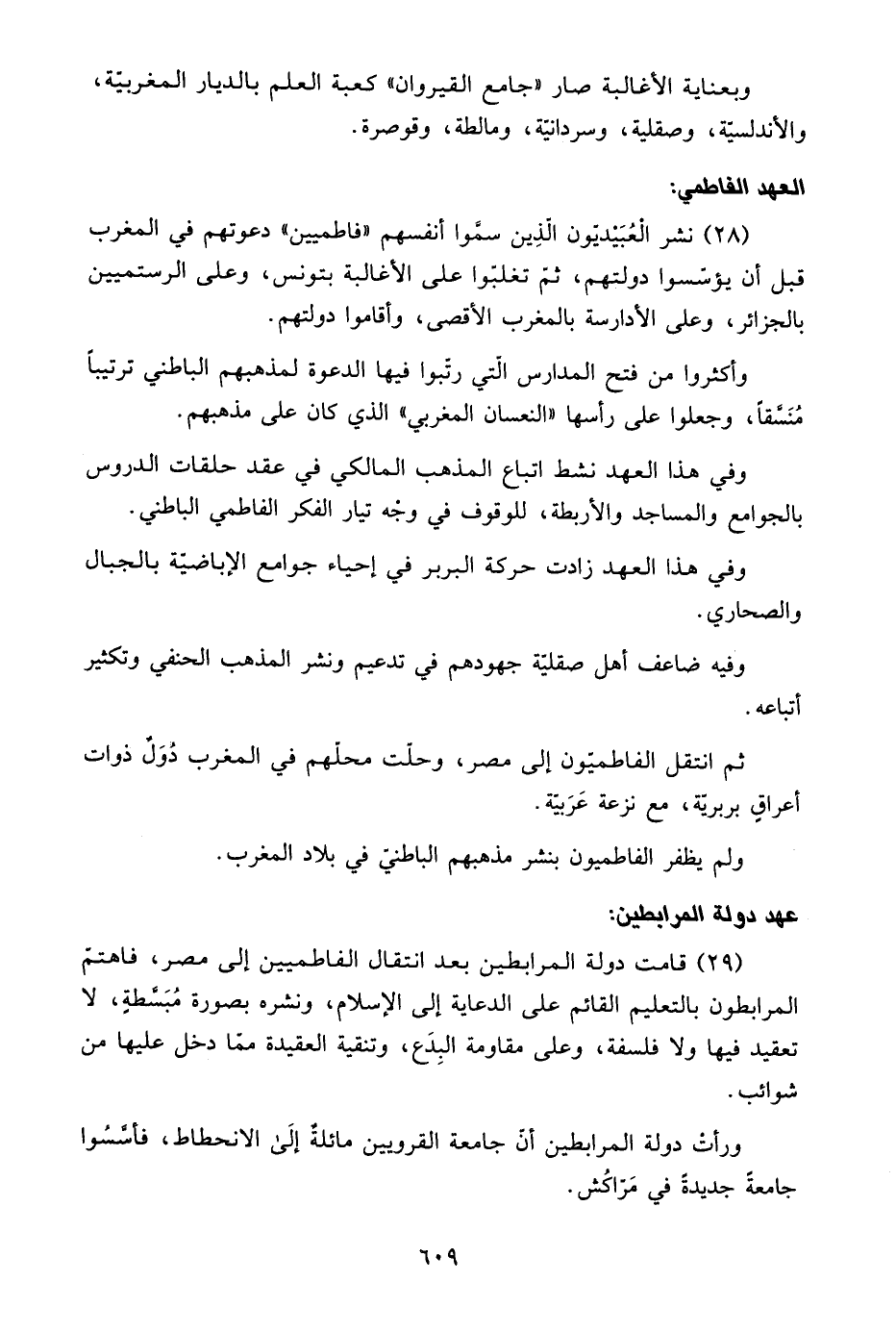 29- قامت دولة المرابطين بعد انتقال الفاطميين إلى مصر، فاهتم المرابطيون بالتعليم القائم على الدعاية إلى الإسلام، ونشره بصورة مبسطة، ولا تعقيد فيها ولا فلسفة، وعلى مقاومة البدع، وتنقية العقيدة مما دخل عليها من شوائب.