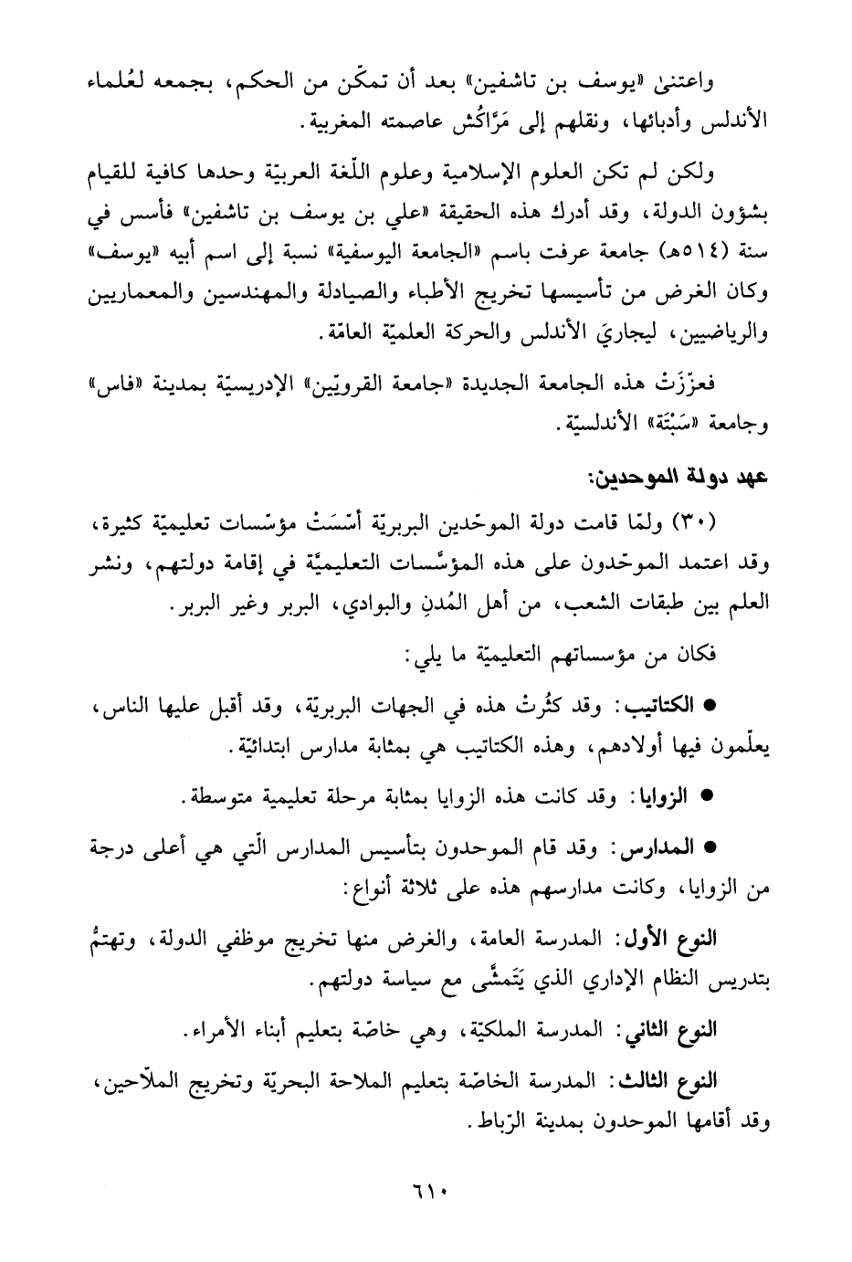 30- ولما قامت دولة الموحدين البربرية أسست مؤسسات تعليمية كثيرة، وقد اعتمد الموحدون على هذه المؤسسات التعليمية في إقامة دولتهم، ونشر العلم بين طبقات الشعب، من أهل المدن والبواطي، والبربر وغير البربر.