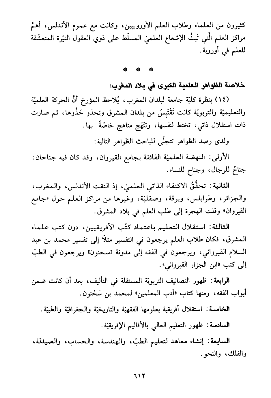 14- بنظرة كلية جامعة لبلدان المغرب، يلاحظ المؤرخ أن الحركة العلمية والتعليمية والتربوية كانت تقتبس من بلدان المشرق وتحذو حذوها، ثم صارت ذات استقلال ذاتي، تختط لنفسها، وتنهج مناهج خاصة بها.