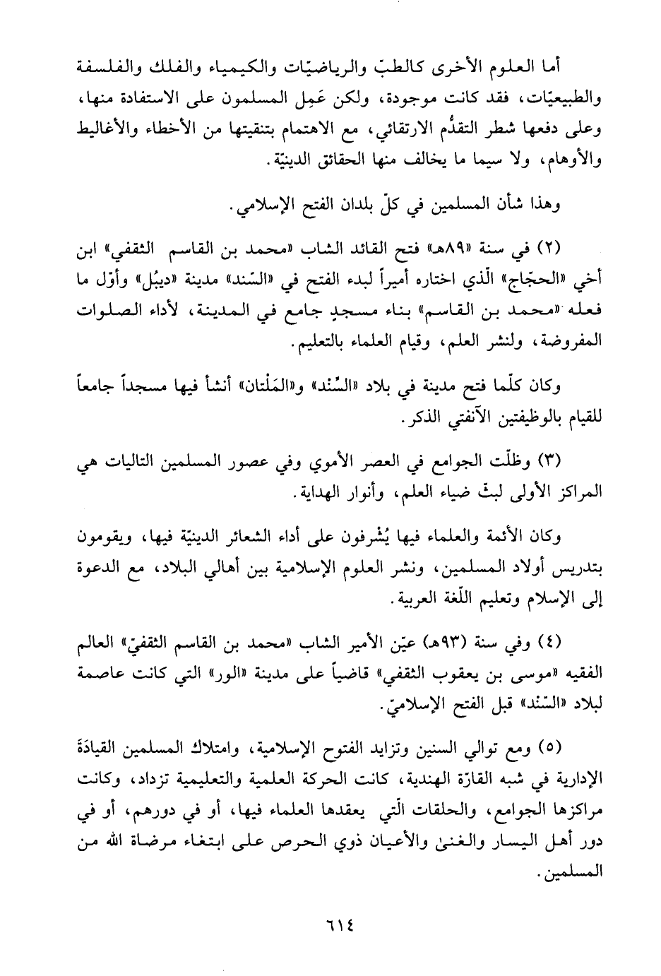 2- في سنة "89هـ" فتح القائد الشاب "محمد بن القاسم الثقفي" ابن أخي "الحجاج" الذي اختاره أميرًا لبدء الفتح في "السند" مدينة "ديبل" وأول ما فعله "محمد بن القاسم" بناء مجسد جامع في المدينة، لأداء الصلوات المفروضة، ولنشر العلم، وقيام العلماء بالتعليم.