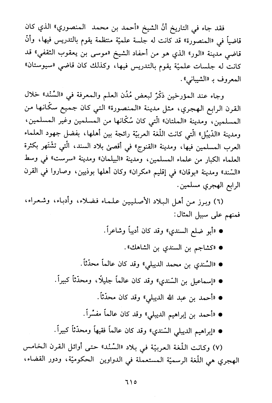 7- وكانت اللغة العربية في بلاد "السند" حتى أوائل القرن الخامس الهجري هي اللغة الرسمية المستعملة في الدواوين الحكومية، ودور القضاء،