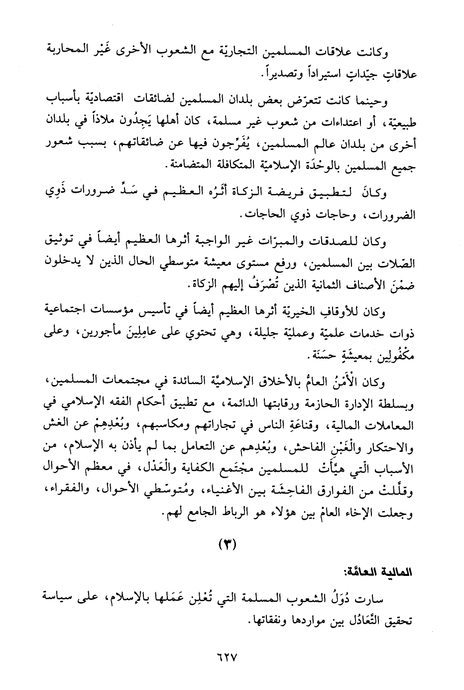 كانت شعوب الأمة الإسلامية في ظل إدارات الحكام المسلمين تعيش في تكامل اقتصادي، من كل أنواع مطالب الحياة، وكان التجار المسلمون ينقلون سلعهم التجارية من أقصى بلدان عالم المسلمين إلى أقصاها، شرقًا وغربًا وجنوبًا وشمالًا.