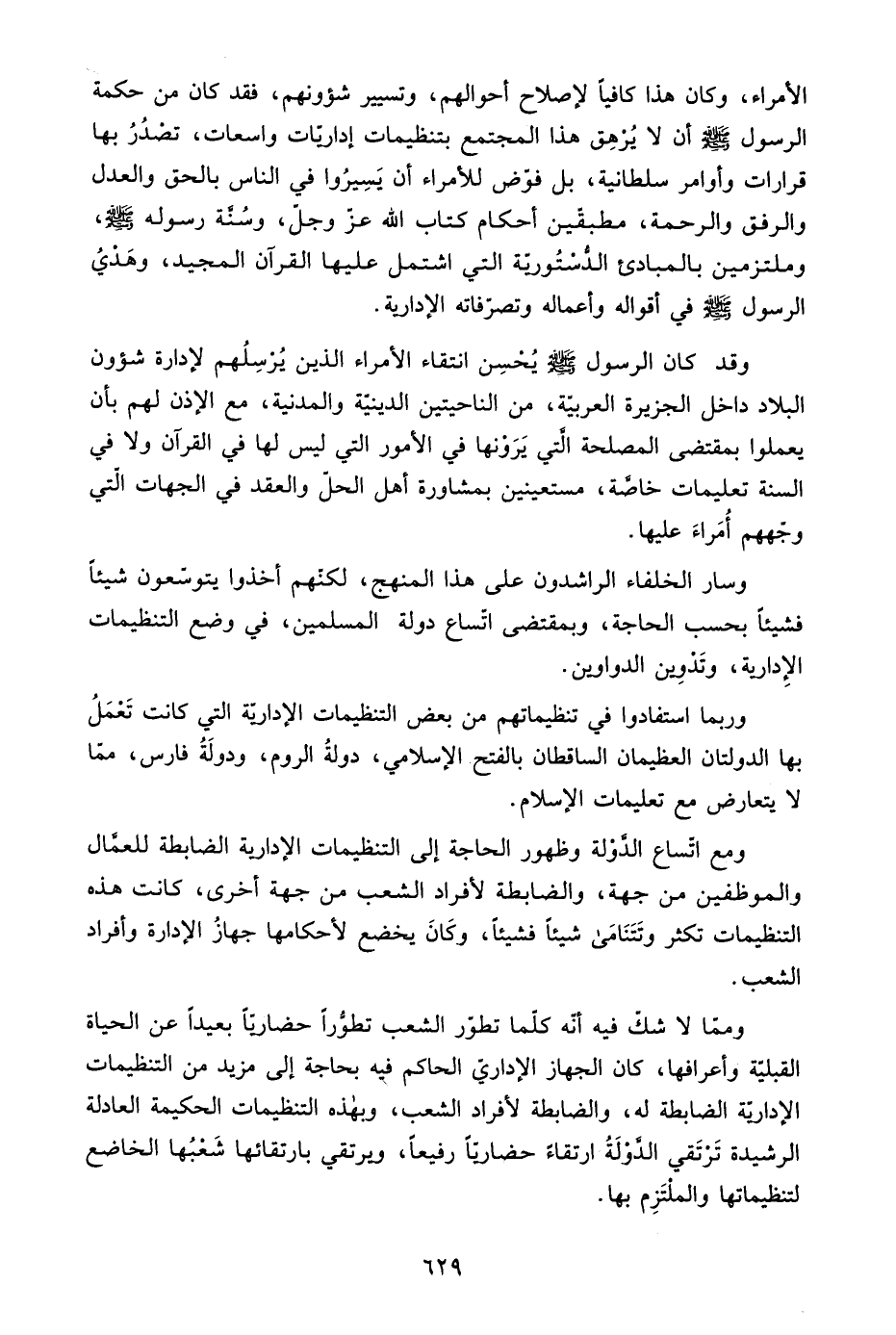 الأمراء، وكان هذا كافيًا لإصلاح أحوالهم، وتسيير شئونهم، فقد كان من حكمة الرسول صلى الله عليه وسلم أن لا يرهق هذا المجتمع بتنظيمات إدارايت واسعات، تصدر ربها قرارات وأوامر سلطانية، بل فوض للأمراء أن يسيروا في الناس بالحق والعدل والرفق والرحمة، مطبقين أحكام كتاب الله عز وجل وسنة رسوله صلى الله عليه وسلم، وملتزمين بالمبادئ الدستورية التي اشتمل عليها القرآن المجيد، وهدي الرسول صلى الله عليه وسلم في أقواله وأعماله وتصرفاته الإدارية.
