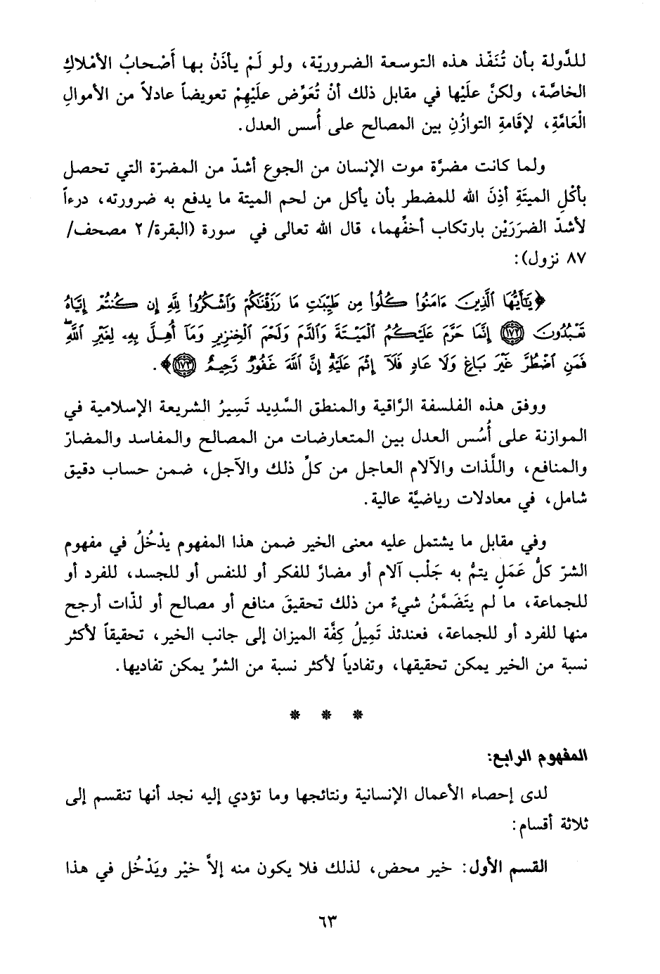 ووفق هذه الفلسفة الراقية والمنطق السديد تسير الشريعة الإسلامية في الموازنة على أسس العدل بين المتعارضات من المصالح والمفاسد والمضار والمنافع واللذات والآلام العاجل من كل ذلك والآجل، ضمن حساب دقيق شامل، في معادلات رياضية عالية.