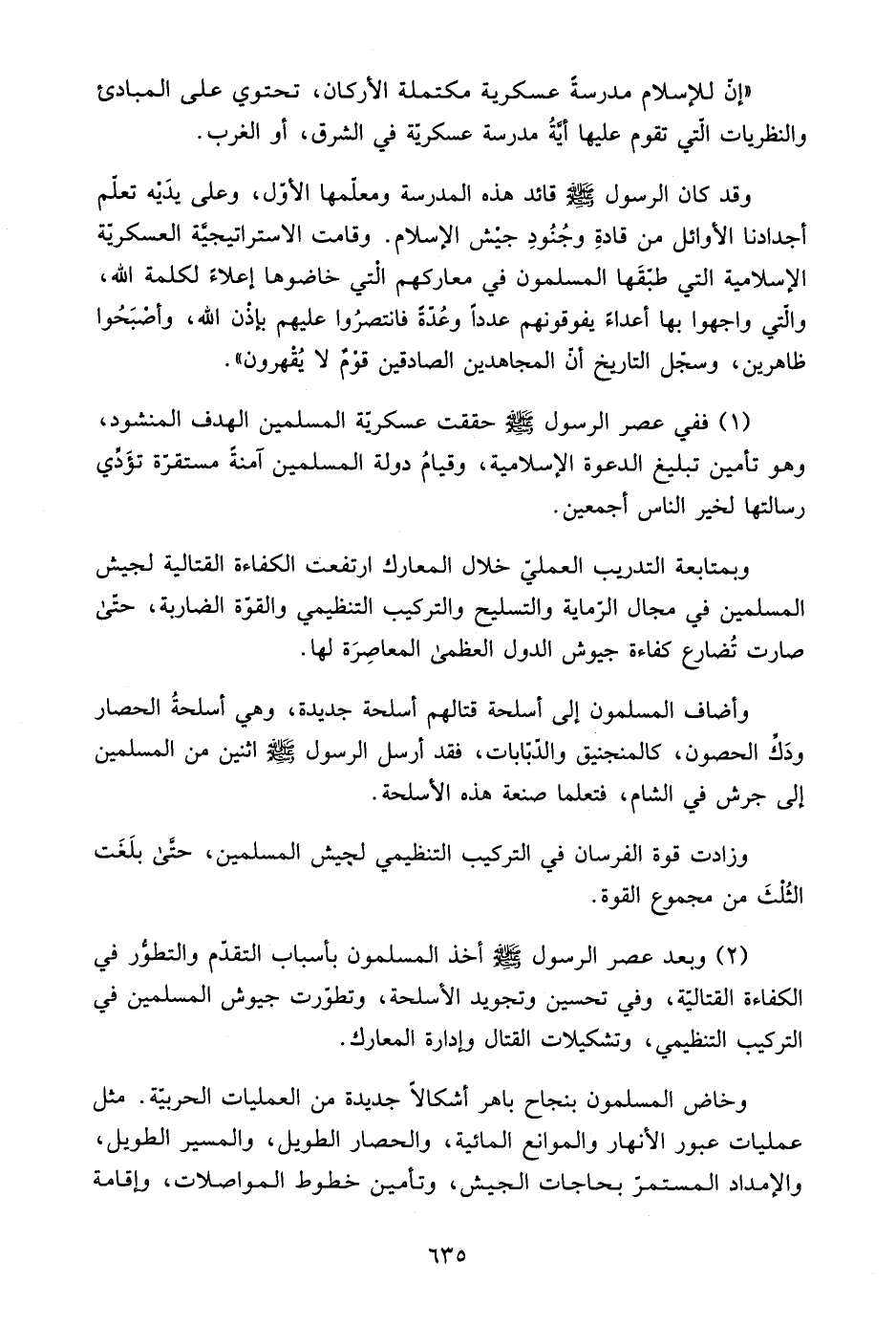 "إن للإسلام مدرسة عسكرية مكتملة الأركان، تحتوي على المبادئ والنظريات التي تقوم عليها أية مدرسة عسكرية في الشرق، أو الغرب.
