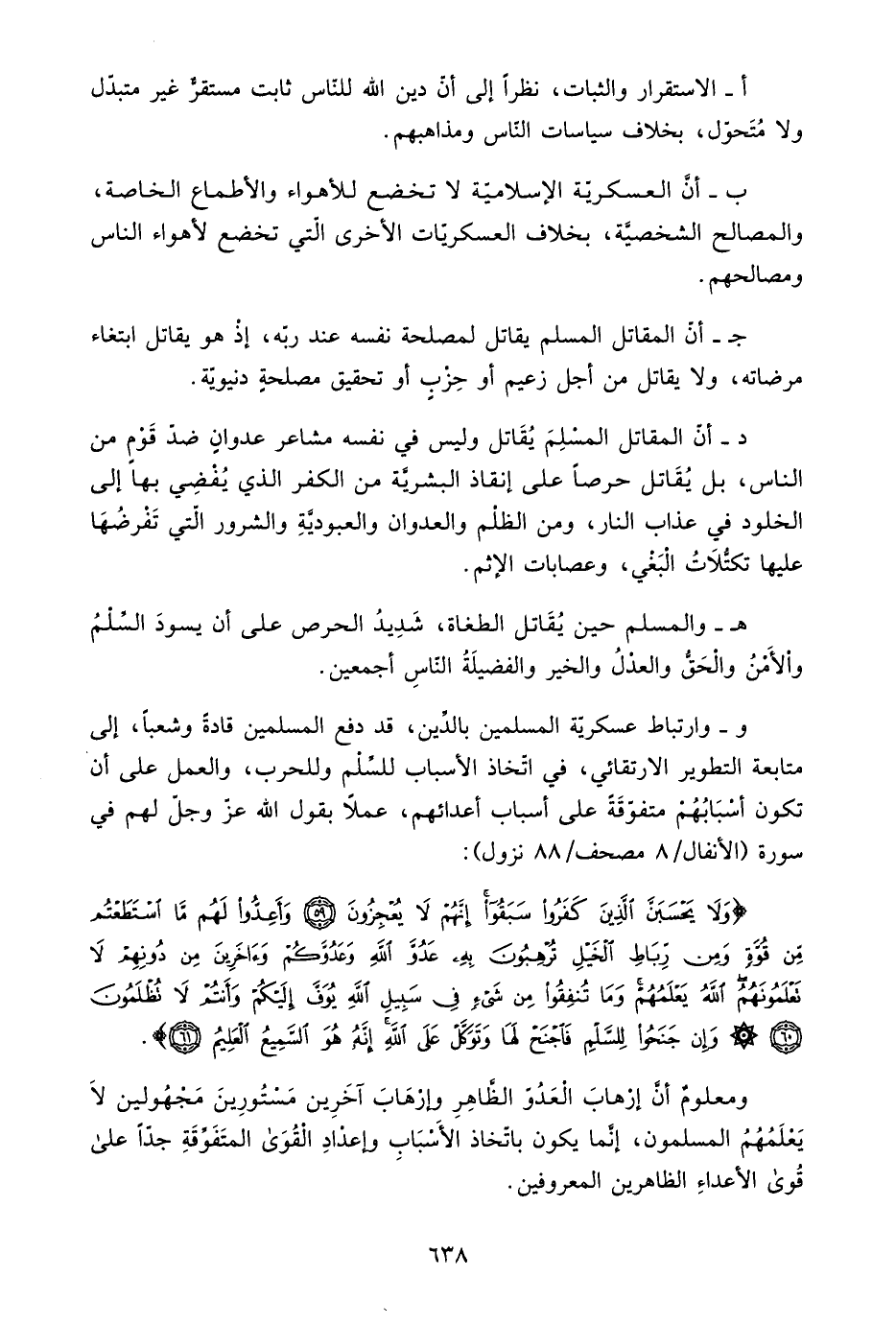 ب- أن العسكرية الإسلامية لا تخضع للأهواء والأطماع الخاصة، والمصالح الشخصية، بخلاف العسكريات الأخرى التي تخضع لأهواء الناس ومصالحهم.
