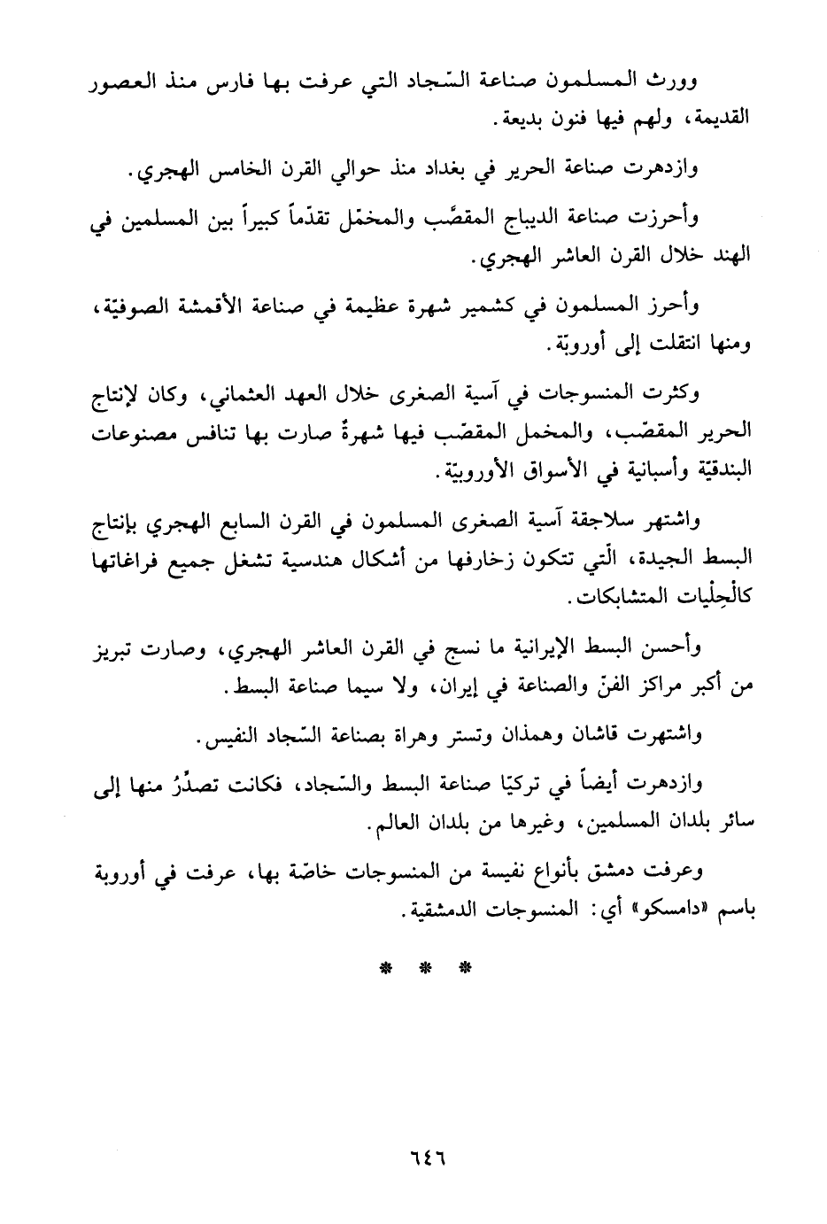 وورث المسلمون صناعة السجاد التي عرفت بها فارس منذ العصور القديمة، ولهم فيها فنون بديعة.