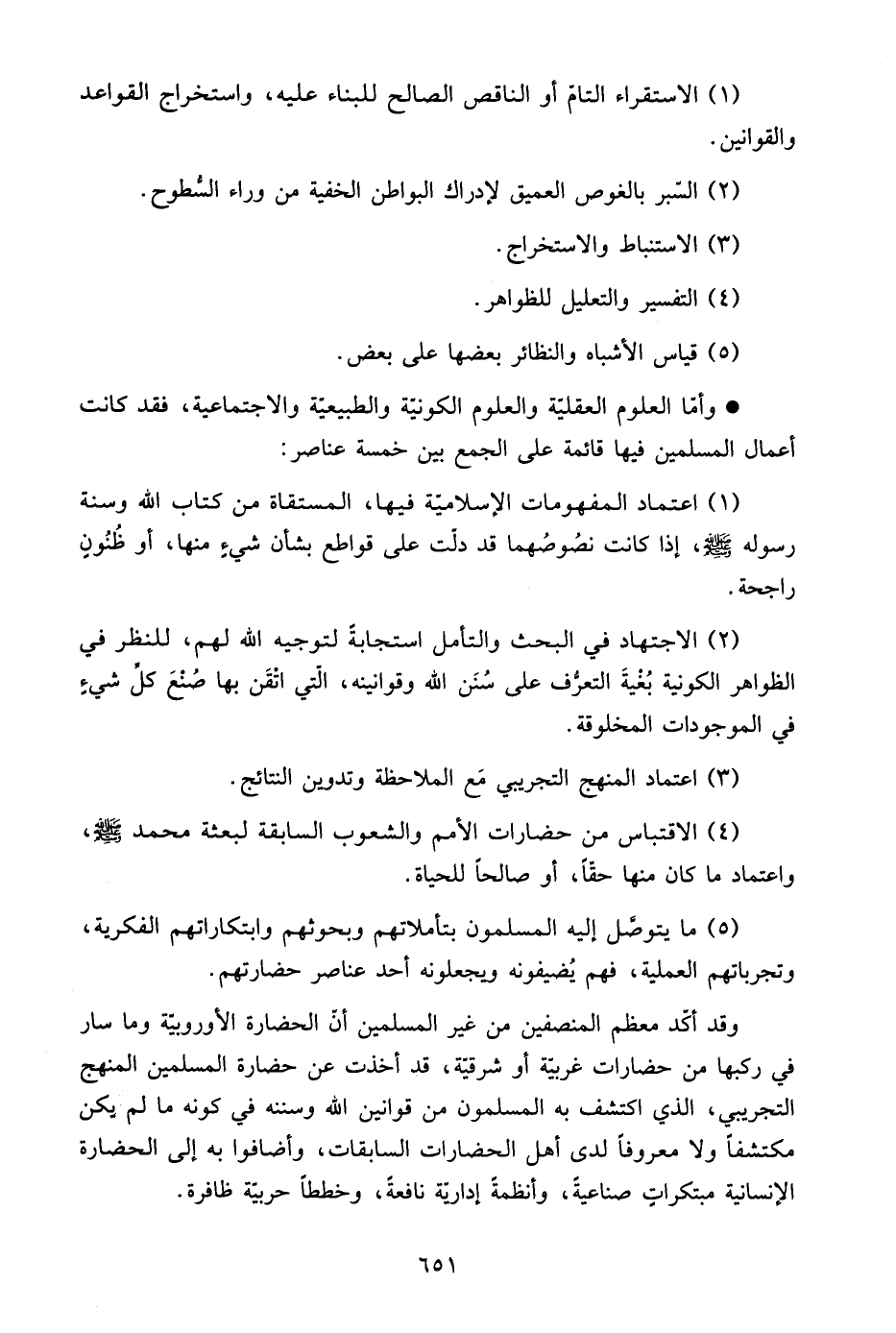 - وأما العلوم العقلية والعلوم الكونية والطبيعية والاجتماعية، فقد كانت أعمال المسلمين فيها قائمة على الجمع بين خمسة عناصر: