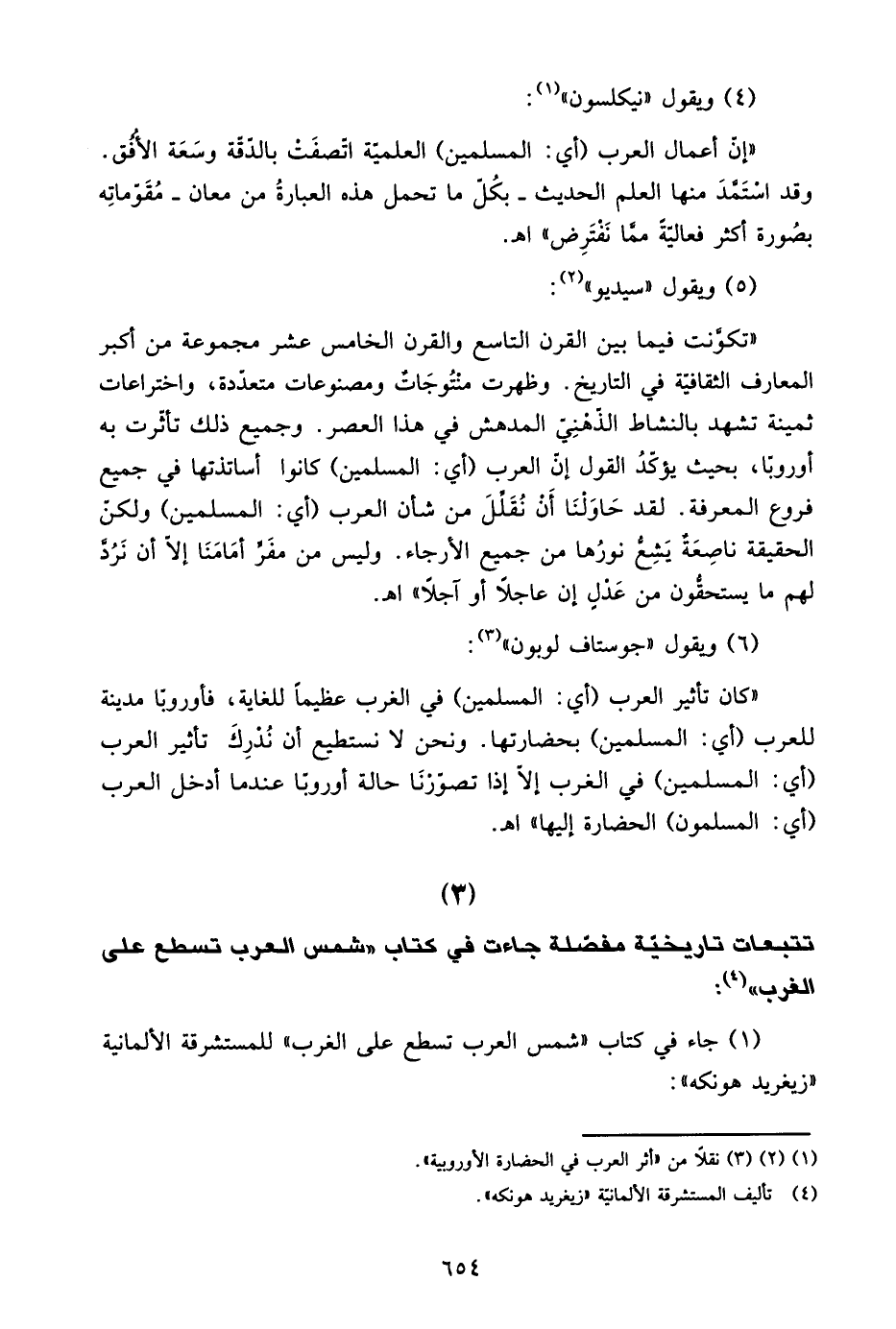"تكونت فيما بين القرن التاسع والقرن الخامس عشر مجموعة من أكبر المعارف الثقافية في التاريخ، وظهرت منتوجات ومصنوعات متعددة، واختراعات ثمينة تشهد بالنشاط الذهبي المدهش في هذا العصر. وجميع ذلك تأثرت به أوروبا، بحيث يؤكد القول إن العرب "أي: المسلمين" كانوا أساتذتها في جميع فروع المعرفة، لقد حاولنا أن نقلل من شأن العرب "أي: المسلمين" ولكن الحقيقة ناصعة يشع نورها من جميع الأرجاء. وليس من مفر أمامنا إلا أن نرد لهم ما يستحقون من عدل إن عاجلًا أو آجلًا". ا. هـ.