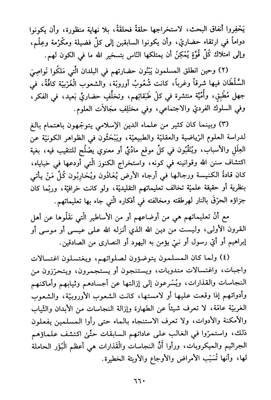 4- ولما كان المسلمون يتوضئون لصلواتهم، ويغتسلون اغتسالات واجبات، واغتسالات مندوبات، ويستنجون أو يستجمرون، ويتحرزون من النجاسات والقذارات، ويسرعون إلى إزالتها عن أجسادهم وثيابهم وأماكنهم وأدواتهم إذا وقعت عليها أو لامستها، كانت الشعوب الأوروبية، والشعوب الغربية عامة، لا تعرف شيئًا عن الطهارة وإزالة النجاسات من الأبدان والثياب والأمكنة والأدوات، ولا تعرف الاستنجاء بالماء حتى رأوا المسلمين يفعلون ذلك، واستمروا في الغالب على عاداتهم السابقات حتى اكتشف علماؤهم الجراثيم والميكروبات، ورأوا أن النجاسات والقذارات هي أعظم البؤر الحاملة لها، وأنها تسبب الأمراض والأوجاع والأوبئة الخطيرة.