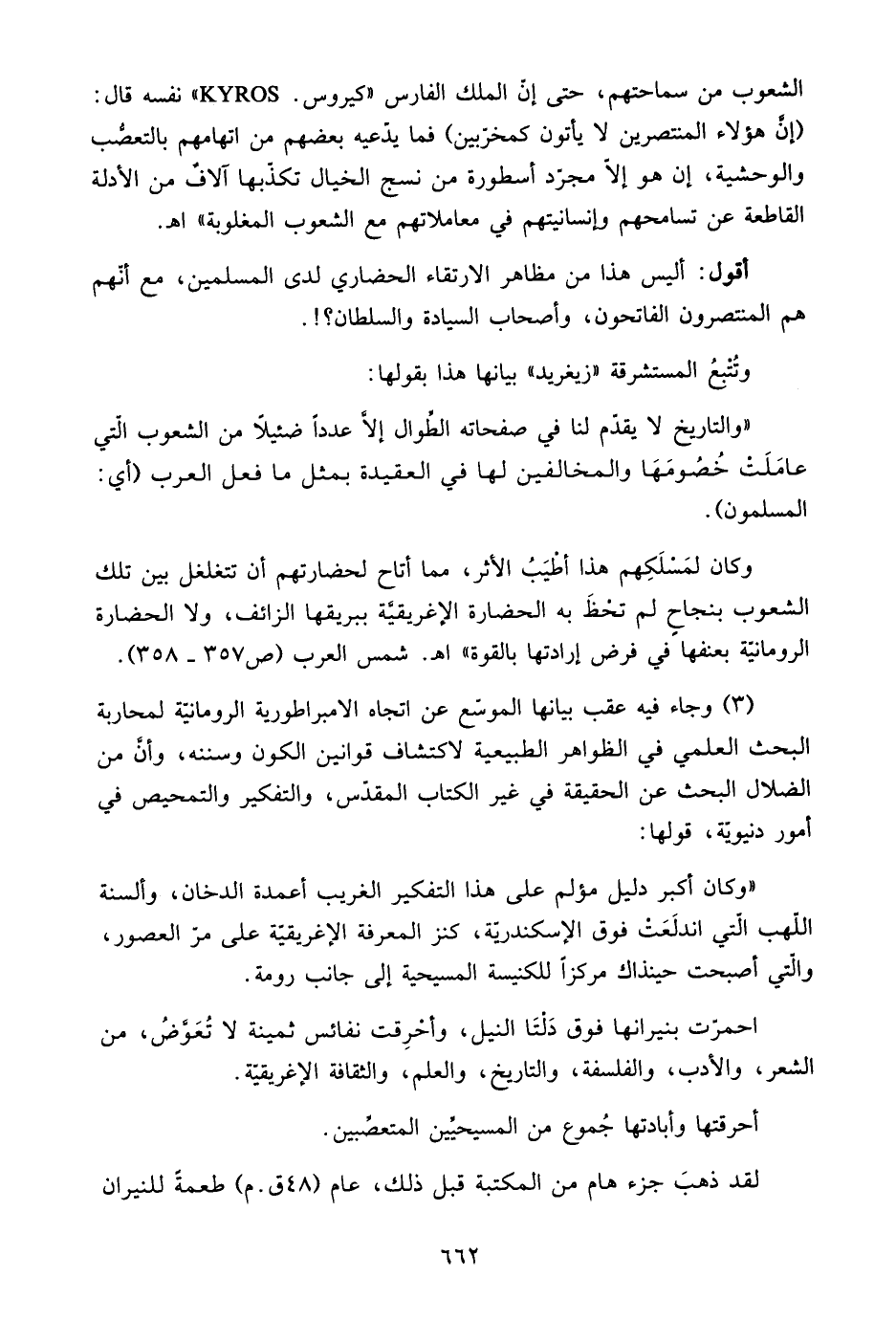 "والتاريخ لا يقدم لنا في صفحاته الطوال إلا عددًا ضئيلًا من الشعوب التي عاملت خصومها والمخالفين لها في العقيدة بمثل ما فعل العرب "أي: المسلمون".