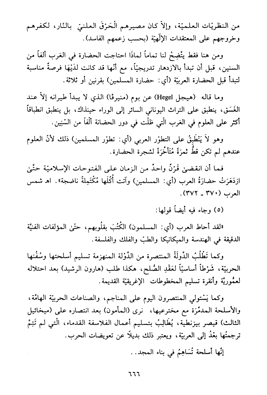 وما قال "هيجل HEGEL" عن بوم "منيرفا" الذي لا يبدأ طيرانه إلا عند الغسق، ينطبق على التراث اليوناني السائر إلى الوراء حينئذاك، بل ينطبق انطباقًا أكثر على العلوم في الغرب التي ظلت في دور الحضانة ألفًا من السنين.