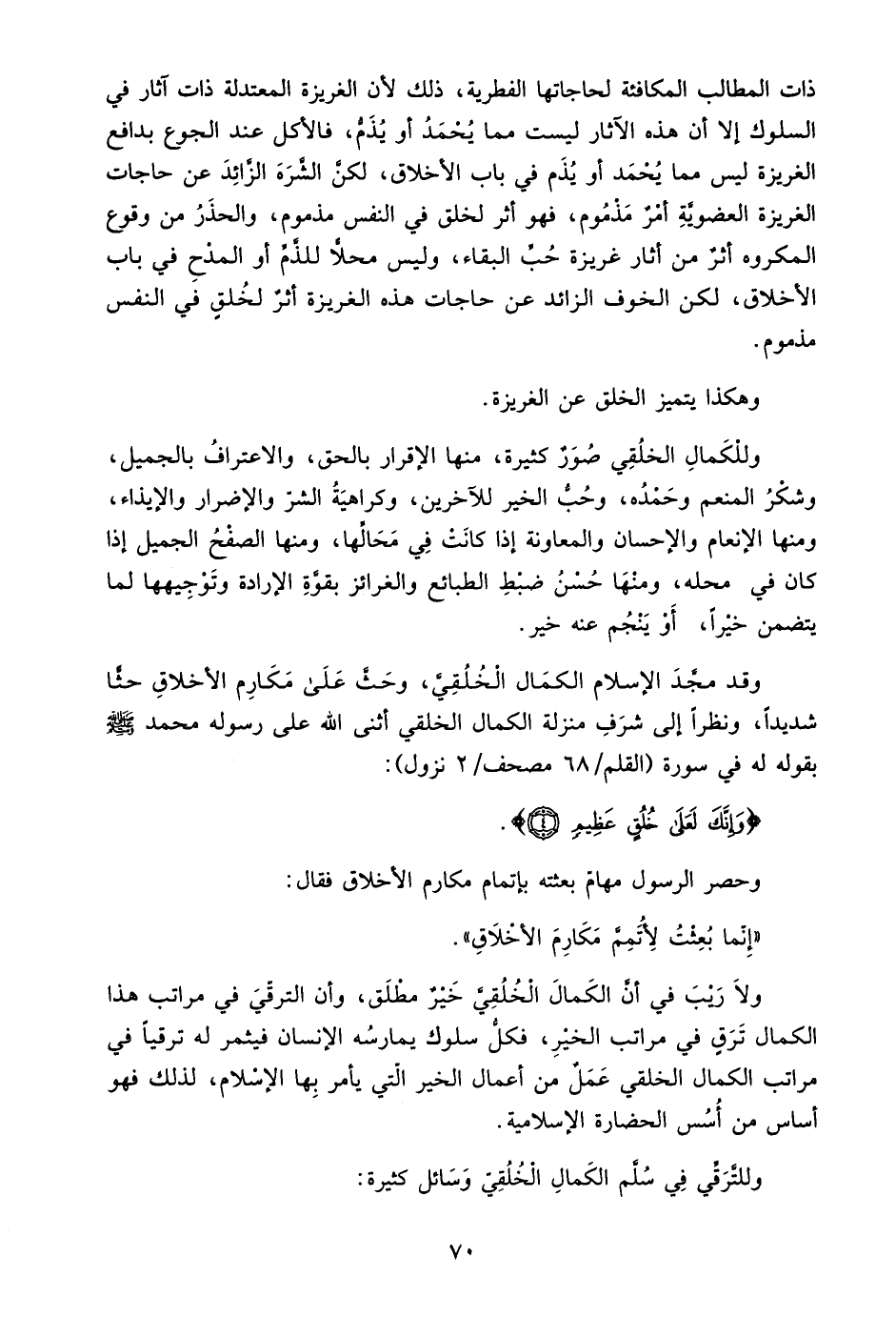 وقد مجد الإسلام الكمال الخلقي، وحث على مكارم الأخلاق حثًّا شديدًا، ونظرًا إلى شرف منزلة الكمال الخلقي أثنى الله على رسوله محمد صلى الله عليه وسلم بقوله له في سورة "القلم: 68 مصحف/ 2 نزول":