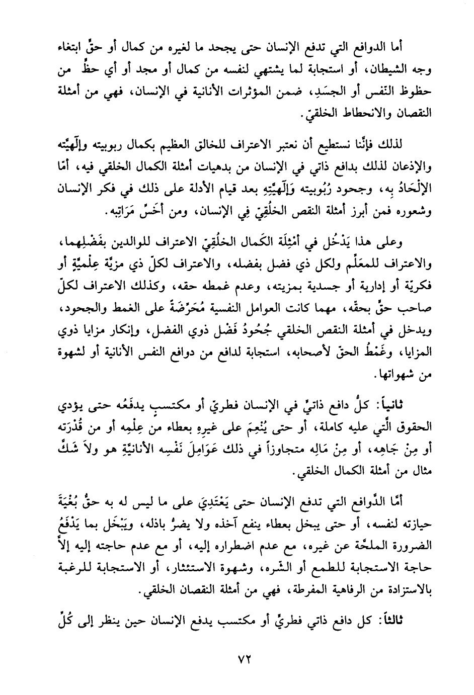 وعلى هذا يدخل في أمثلة الكمال الخلقي الاعتراف للوالدين بفضلهما، والاعتراف للمعلم ولكل ذي فضل بفضله، والاعتراف لكل ذي مزية علمية أو فكرية أو إدارية أو جسدية بمزيته، وعدم غمطه حقه، وكذلك الاعتراف لكل صاحب حق بحقه، مهما كانت العوامل النفسية محرضة على الغمط والجحود، ويدخل في أمثلة النقص الخلقي جحود فضل ذوي الفضل، وإنكار مزايا ذوي المزايا، وغمط الحق لأصحابه، استجابة لدافع من دوافع النفس الأنانية أو لشهوة من شهواتها.