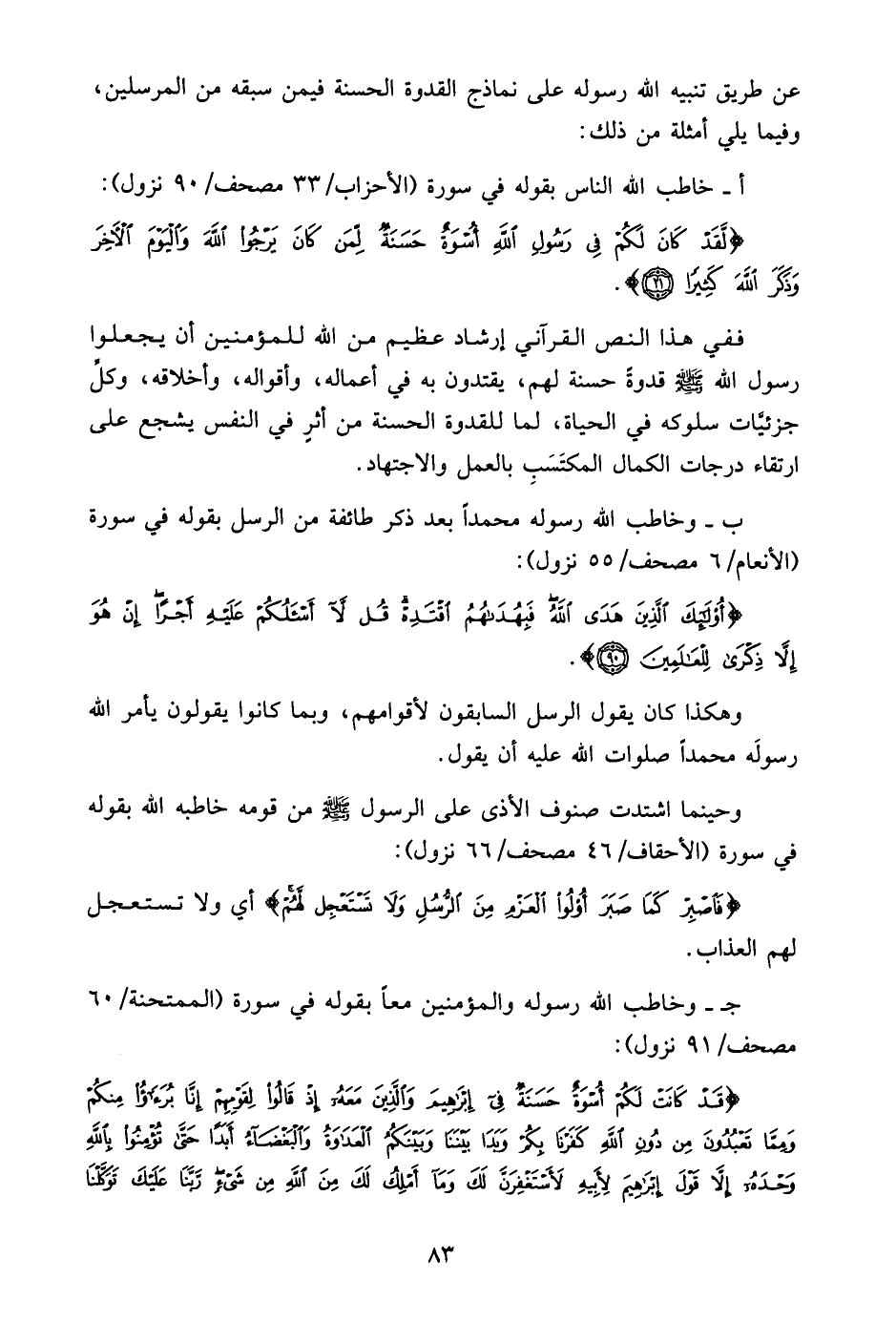 أ- خاطب الله الناس بقوله في سورة "الأحزاب: 33 مصحف/ 90 نزول": {لَقَدْ كَانَ لَكُمْ فِي رَسُولِ اللَّهِ أُسْوَةٌ حَسَنَةٌ لِمَنْ كَانَ يَرْجُو اللَّهَ وَالْيَوْمَ الآخِرَ وَذَكَرَ اللَّهَ كَثِيرًا} .