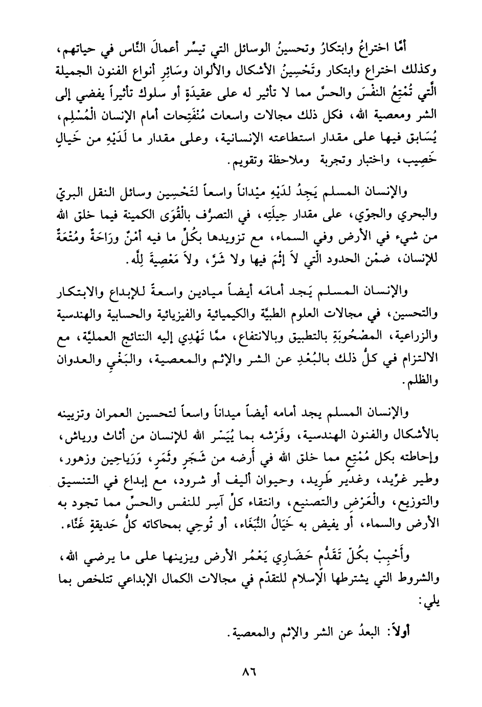 أما اختراع وابتكار وتحسين الوسائل التي تيسر أعمال الناس في حياتهم، وكذلك اختراع وابتكار وتحسين الأشكال والألوان وسائر أنواع الفنون الجميلة التي تمتع النفس والحس مما لا تأثير له على عقيدة أو سلوك تأثيرًا يفضي إلى الشر ومعصية الله، فكل ذلك مجالات واسعات منفتحات أمام الإنسان المسلم، يسابق فيها على مقدار استطاعته الإنسانية، وعلى مقدار ما لديه من خيال خصيب، واختيار وتجربة وملاحظة وتقويم.