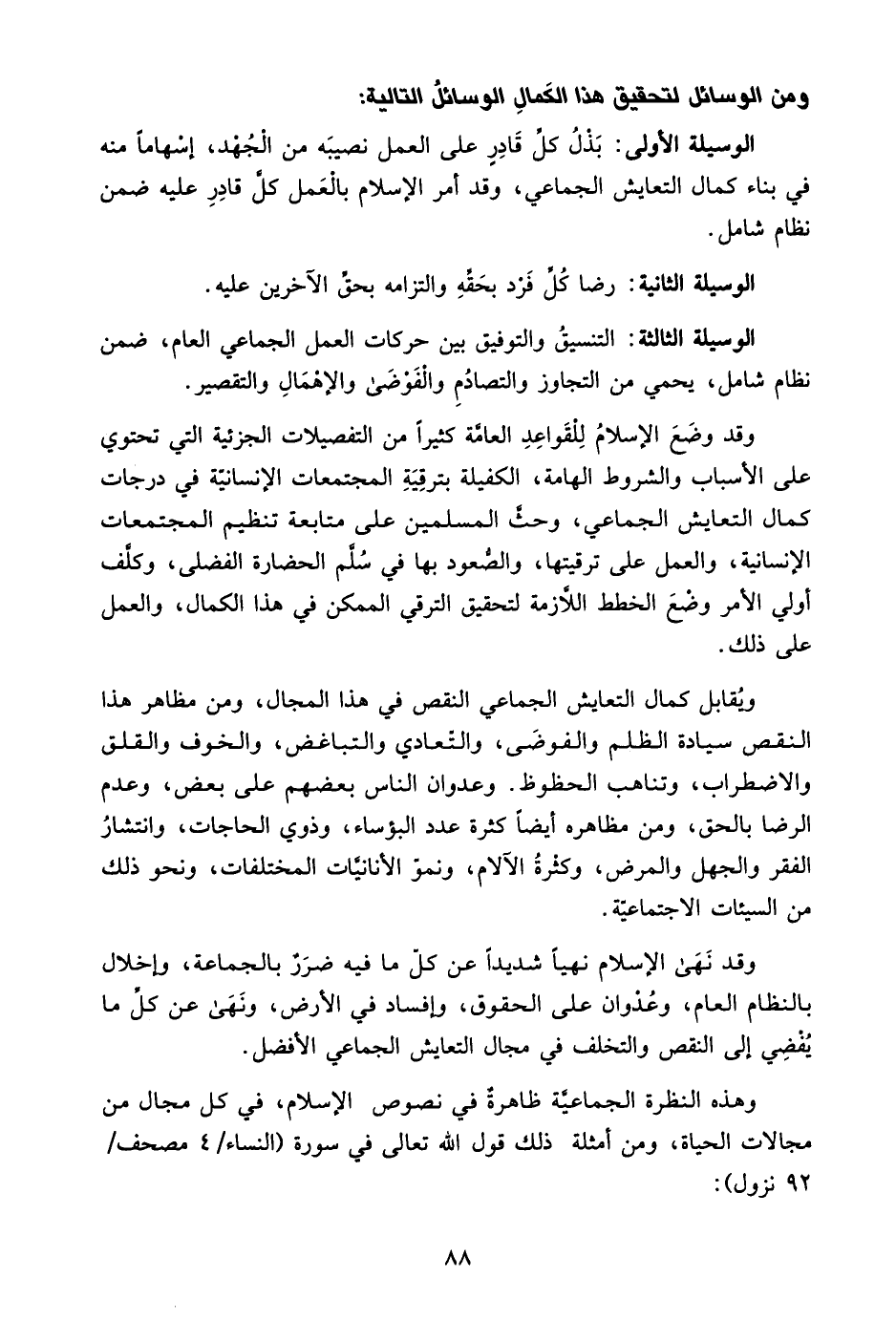 وقد وضع الإسلام للقواعد العامة كثيرًا من التفصيلات الجزئية التي تحتوي على الأسباب والشروط الهامة، الكفيلة بترقية المجتمعات الإنسانية في درجات كمال التعايش الجماعي، وحث المسلمين على متابعة تنظيم المجتمعات الإنسانية، والعمل على ترقيتها، والصعود بها في سلم الحضارة الفضلى، وكلف أولي الأمر وضع الخطط اللازمة لتحقيق الترقي الممكن في هذا الكمال، والعمل على ذلك.