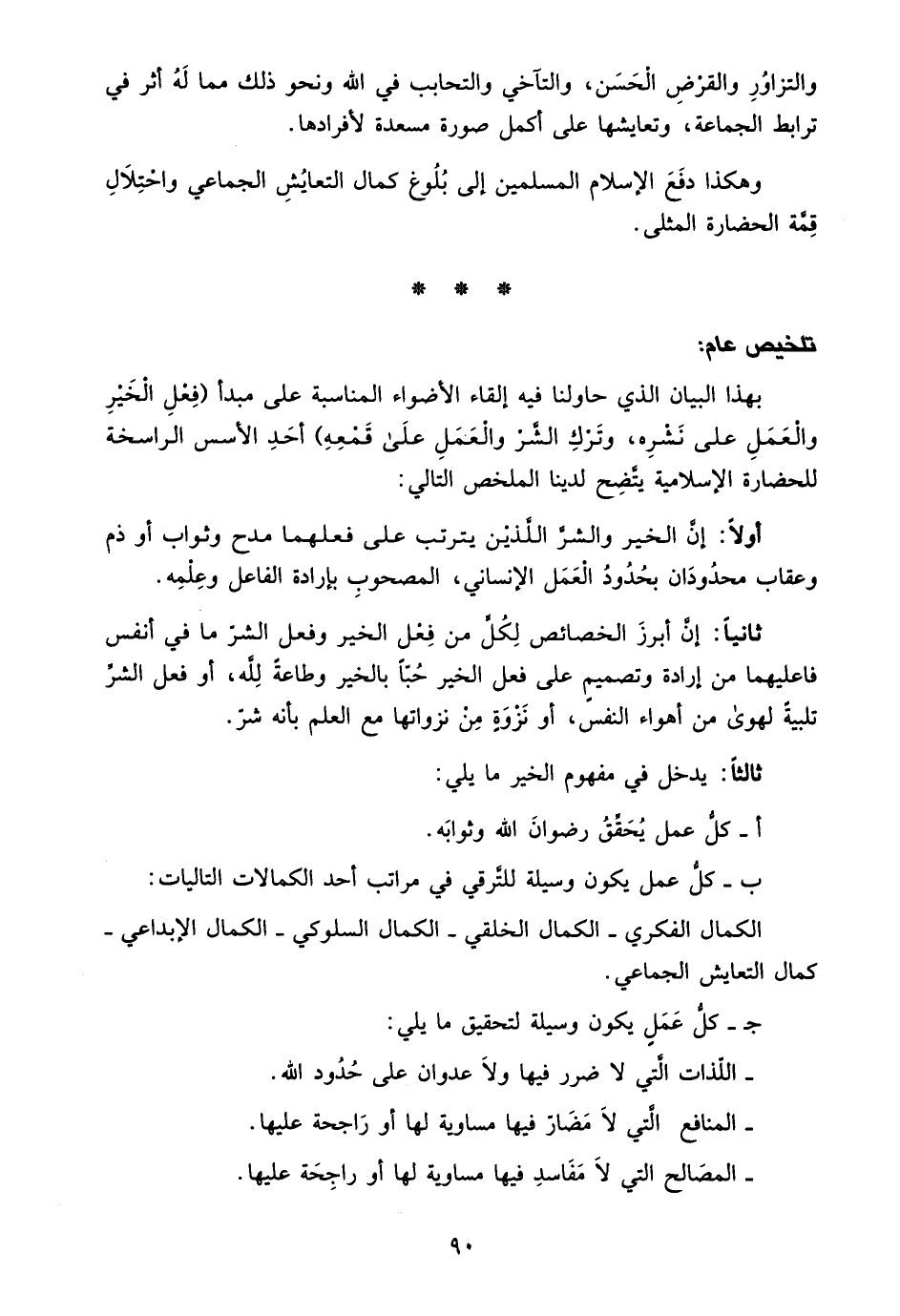 بهذا البيان الذي حاولنا فيه إلقاء الأضواء المناسبة على مبدأ "فعل الخير والعمل على نشره، وترك الشر والعمل على قمعه" أحد الأسس الراسخة للحضارة الإسلامية يتضح لدينا الملخص التالي: