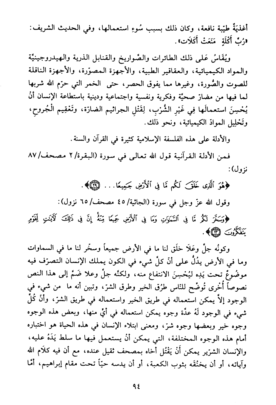 ويقاس على ذلك الطائرات والصواريخ والقنابل الذرية والهيدروجينية والمواد الكيماوية، والعقاقير الطبية، والأجهزة المصورة، والأجهزة الناقلة للصوت والصورة، وغيرها مما يفوق الحصر، حتى الخمر التي حرم الله شربها لما فيها من مضار صحية وفكرية ونفسية واجتماعية ودينية باستطاعة الإنسان أن يحسن استعمالها في غير الشرب، لقتل الجراثيم الضارة، وتعقيم الجروح، وتخليل المواد الكيميائية، ونحو ذلك.