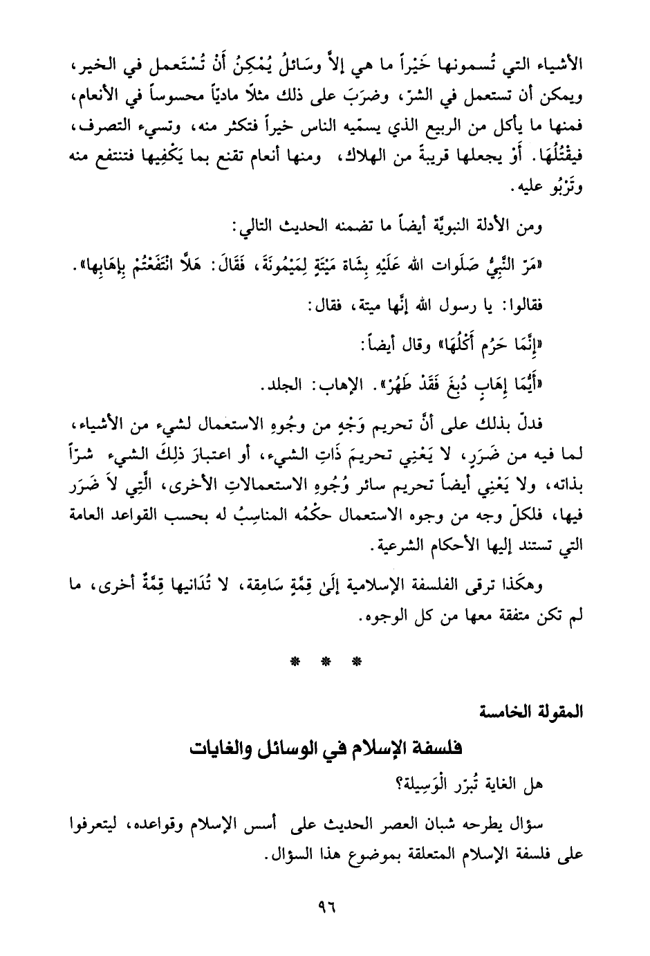 فدل بذلك على أن تحريم وجه من وجوه الاستعمال لشيء من الأشياء، لما فيه من ضرر، لا يغني تحريم ذات الشيء، أو اعتبار ذلك الشيء شرًّا بذاته، ولا يغني أيضًا تحريم سائر وجوه الاستعمالات الأخرى، التي لا ضرر فيها، فلكل وجوه من وجوه الاستعمال حكمه المناسب له بحسب القواعد العامة التي تستند إليها الأحكام الشرعية.