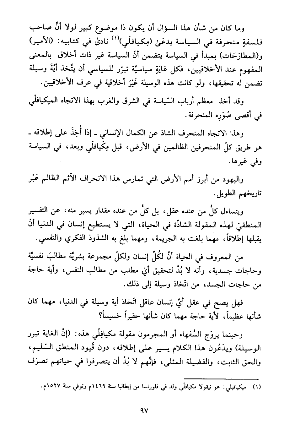 وما كان من شأن هذا السؤال أن يكون ذا موضوع كبير لولا أن صاحب فلسفة منحرفة في السياسة يدعى "مكيافلي"1 نادى في كتابيه: "الأمير" و"المطارحات" بمبدأ في السياسة يتضمن أن السياسة غير ذات أخلاق بالمعنى المفهوم عند الأخلاقيين، فكل غاية سياسية تبرر للسياسي أن يتخذ أية وسيلة تضمن له تحقيقها، ولو كانت هذه الوسيلة غير أخلاقية في عرف الأخلاقيين.